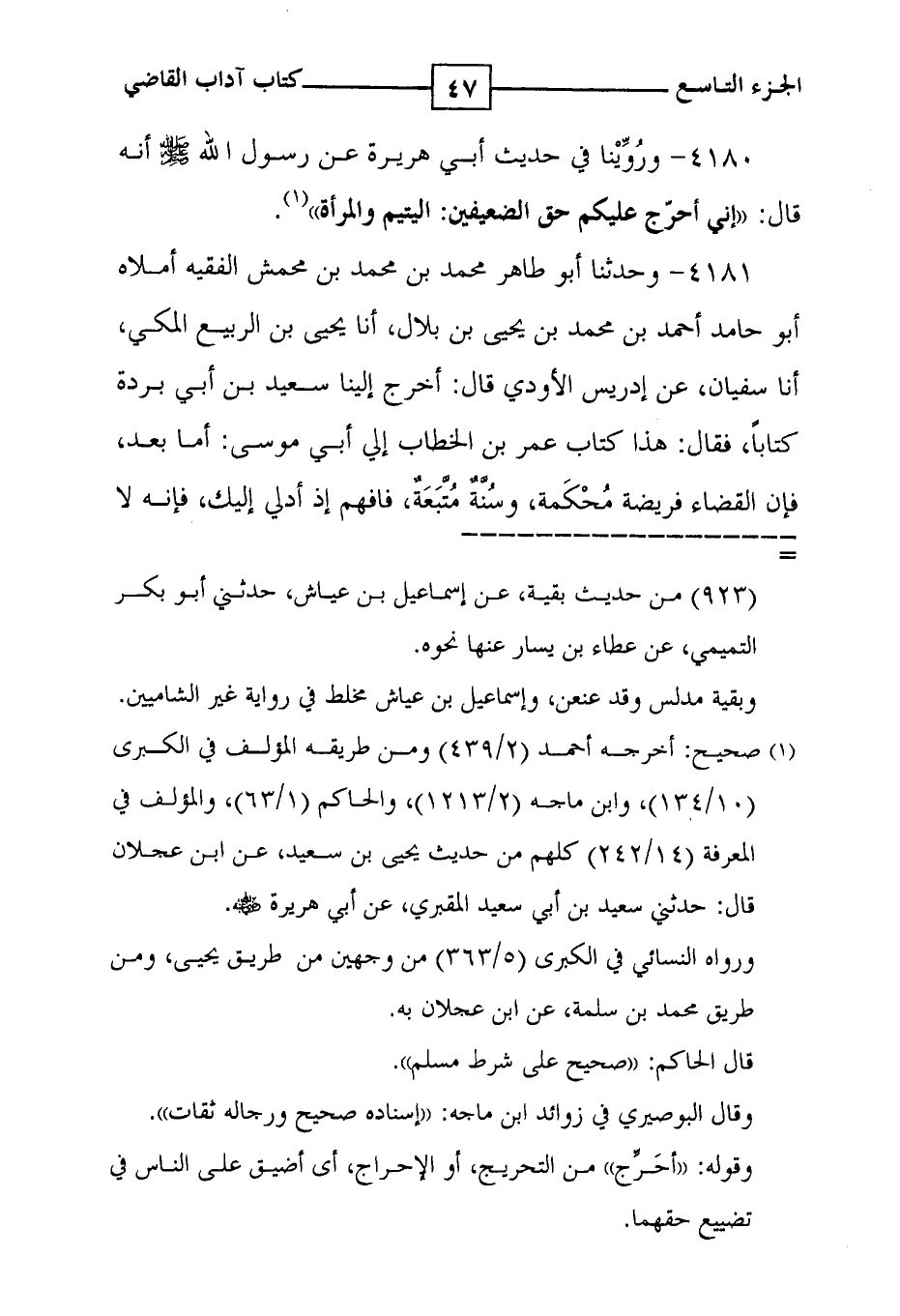 4181 - وحدثنا أبو طاهر محمد بن محمد بن محمش الفقيه أملاه أبو حامد أحمد بن محمد بن يحيى بن بلال ، أنا يحيى بن الربيع المكي ، أنا سفيان ، عن إدريس الأودي قال : أخرج إلينا سعيد بن أبي بردة كتاباً ، فقال : هذا كتاب عمر بن الخطاب إلى أبي موسى : أما بعد ، فإن القضاء فريضة مُحْكَمة ، وسُنَّةٌ مُتَّبَعَةٌ ، فافهم إذ أدلي إليك ، فإنه لا