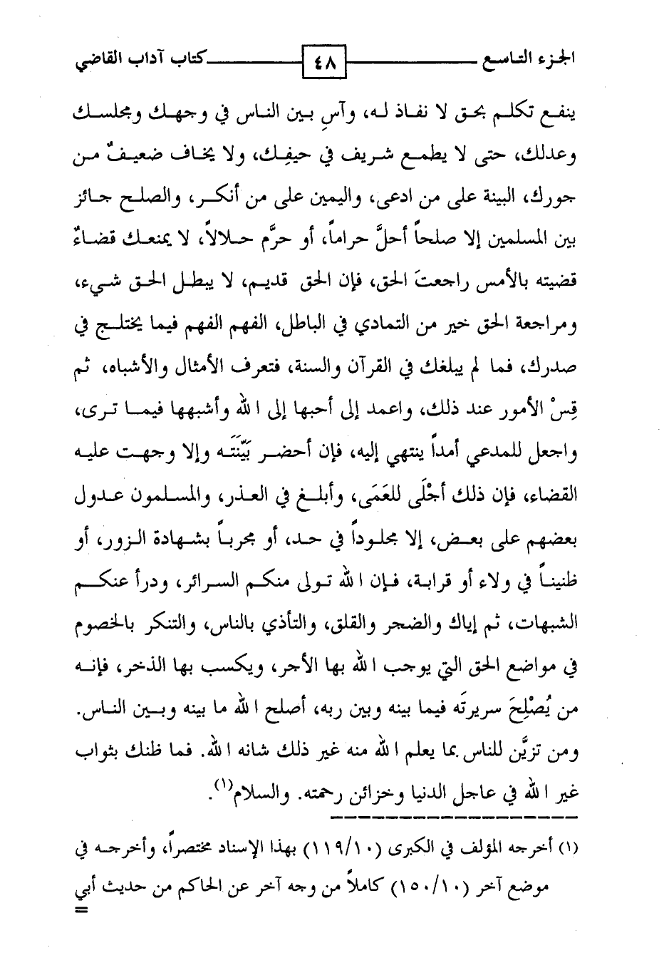 ينفع تكلم بحق لا نفاذ له ، وآسِ بين الناس في وجهك ومجلسك وعدلك ، حتى لا يطمع شريف في حيفِك ، ولا يخاف ضعيفٌ من جورك ، البينة على من ادعى ، واليمين على من أنكر ، والصلح جائز بين المسلمين إلا صلحاً أحلَّ حراماً ، أو حرَّم حلالاً ، لا يمنعك قضاءٌ قضيته بالأمس راجعتَ الحق ، فإن الحق قديم ، لا يبطل الحق شيء ، ومراجعة الحق خير من التمادي في الباطل ، الفهم الفهم فيما يختلج في صدرك ، فما لم يبلغك في القرآن والسنة ، فتعرف الأمثال والأشباه ، ثم قِسْ الأمور عند ذلك ، واعمد إلى أحبها إلى الله وأشبهها فيما ترى ، واجعل للمدعي أمداً ينتهي إليه ، فإن أحضر بَيّنَتَه وإلا وجهت عليه القضاء ، فإن ذلك أجْلَى للعَمَى ، وأبلغ في العذر ، والمسلمون عدول بعضهم على بعض ، إلا مجلوداً في حد ، أو مجرباً بشهادة الزور ، أو ظنيناً في ولاء أو قرابة ، فإن الله تولى منكم السرائر ، ودرأ عنكم الشبهات ، ثم إياك والضجر والقلق ، والتأذي بالناس ، والتنكر بالخصوم في مواضع الحق التي يوجب الله بها الأجر ، ويكسب بها الذخر ، فإنه من يُصْلِحَ سريرتَه فيما بينه وبين ربه ، أصلح الله ما بينه وبين الناس . ومن تزيَّن للناس بما يعلم الله منه غير ذلك شانه الله . فما ظنك بثواب غير الله في عاجل الدنيا وخزائن رحمته . والسلام ( 1 ) .