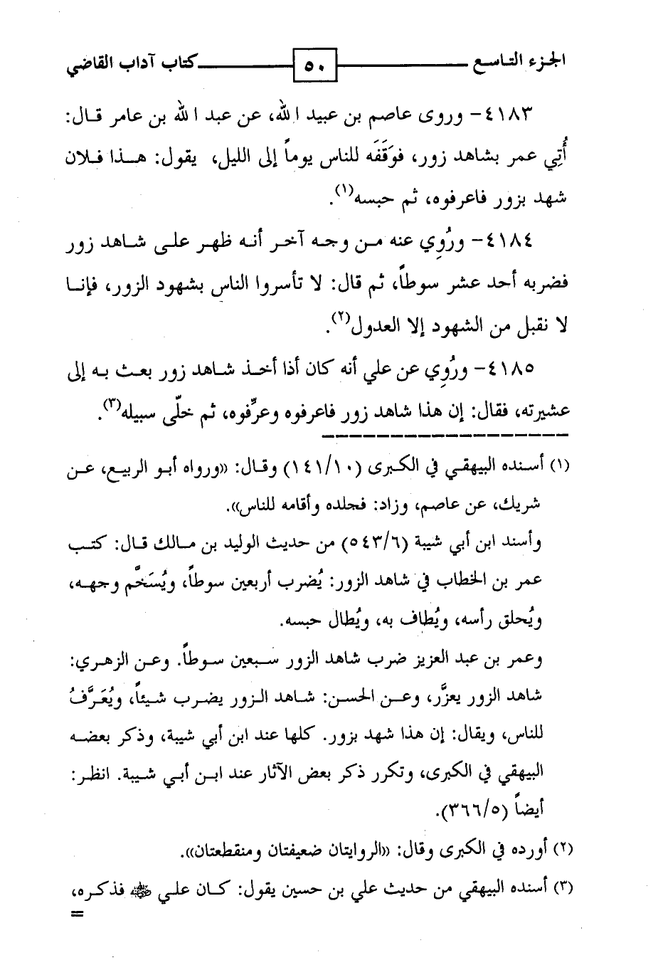 4184 - ورُوِي عنه من وجه آخر أنه ظهر على شاهد زور فضربه أحد عشر سوطاً ، ثم قال : لا تأسروا الناس بشهود الزور ، فإنما لا نقبل من الشهود إلا العدول ( 2 ) .