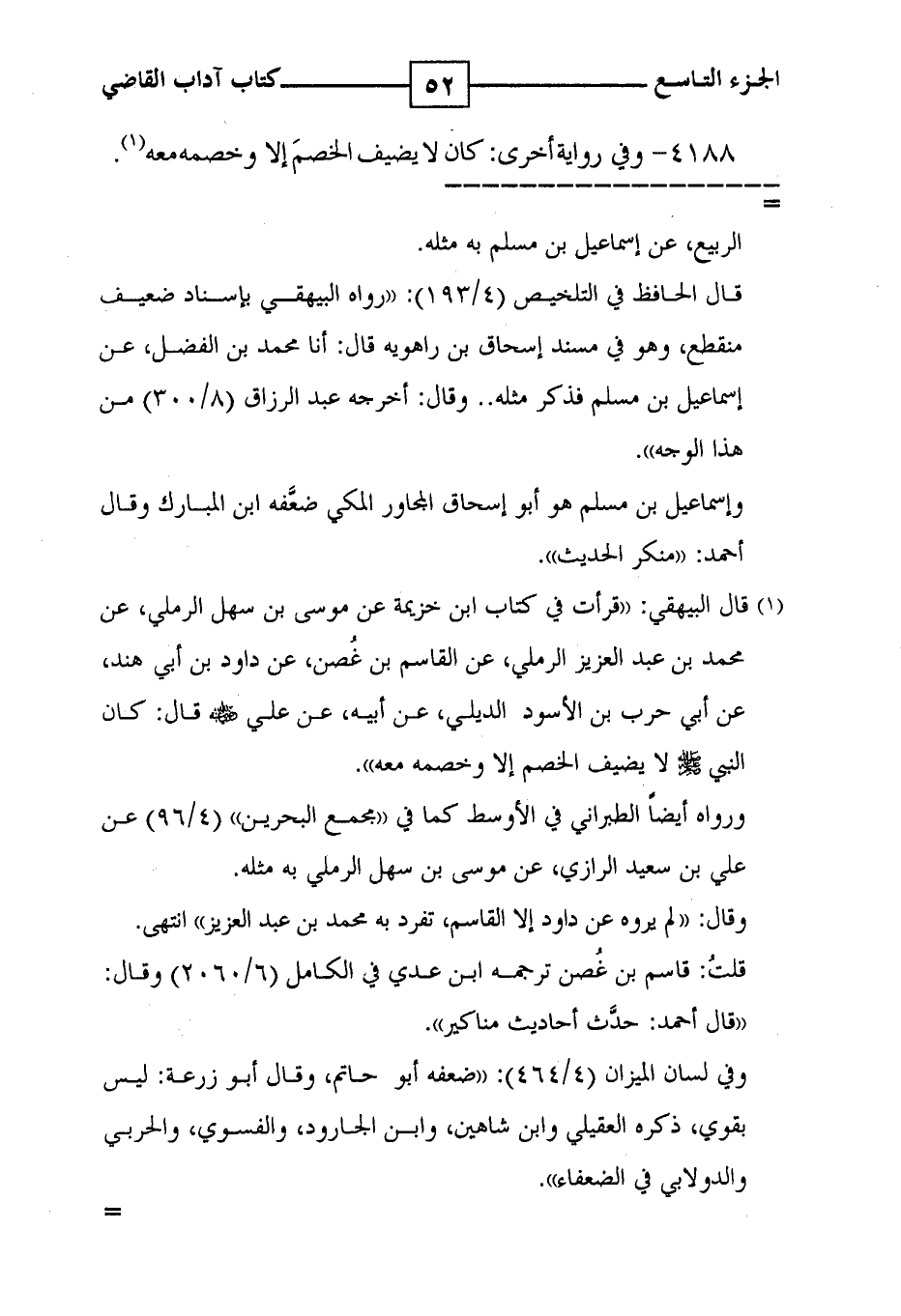 4188 - وفي رواية أخرى : كان لا يضيف الخصمَ إلا وخصمه معه ( 1 ) .