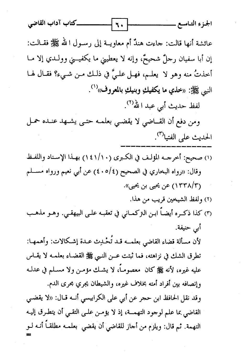 عائشة أنها قالت : جاءت هندٌ أم معاوية إلى رسول الله فقالت : إن أبا سفيان رجلٌ شحيحٌ ، وإنه لا يعطيني ما يكفيني وولدي إلا ما أخذتُ منه وهو لا يعلم ، فهل عليَّ في ذلك من شيء ؟ فقال لها النبي : ' خذي ما يكفيكِ وبنيكِ بالمعروف ' ( 1 ) . لفظ حديث أبي عبد الله ( 2 ) . ومن دفع أن القاضي لا يقضي بعلمه حتى يشهد عنده حمل الحديث على الفتيا ( 3 ) .