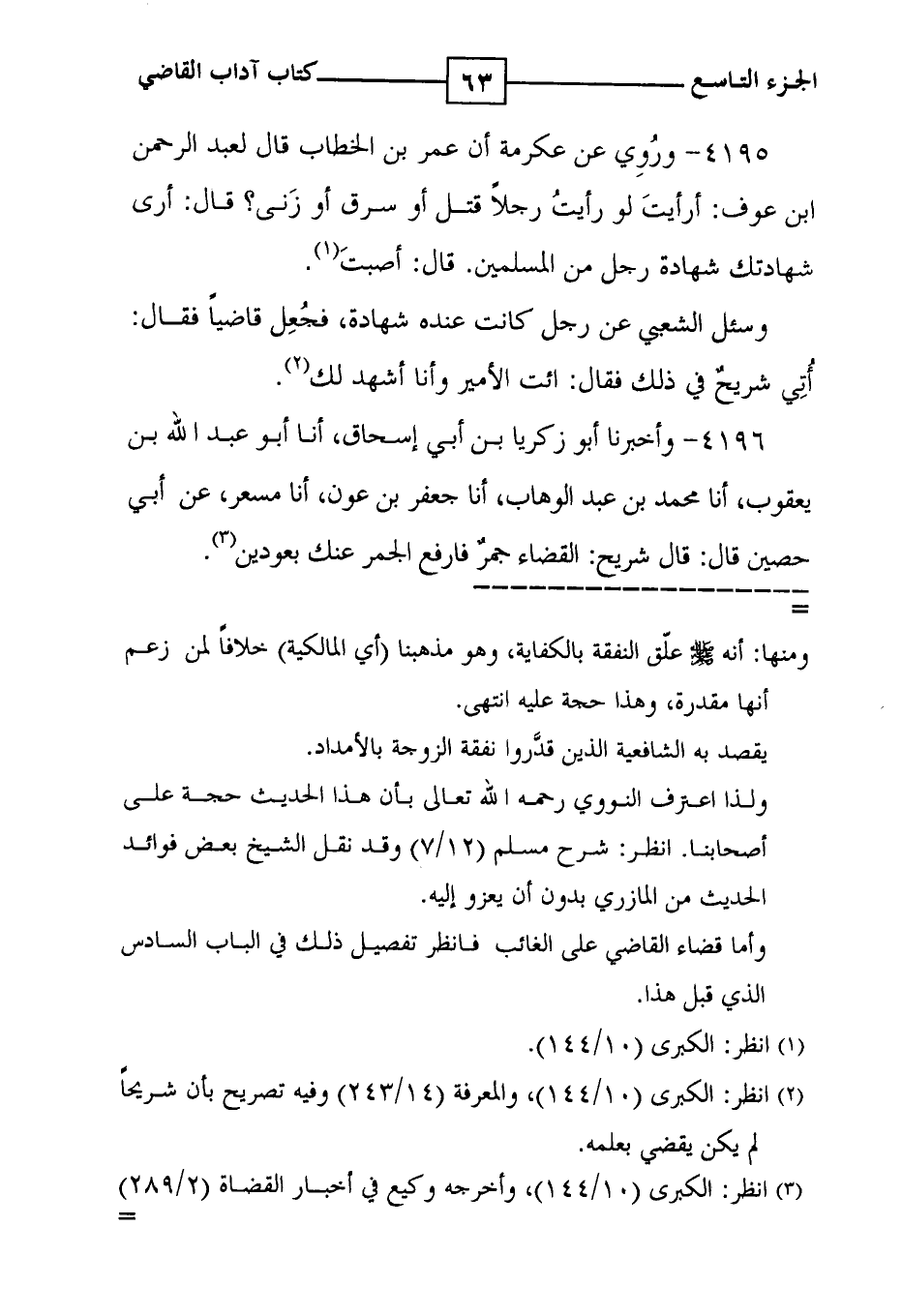4195 - ورُوِي عن عكرمة أن عمر بن الخطاب قال لعبد الرحمن ابن عوف : أرأيتَ لو رأيتُ رجلاً قتل أو سرق أو زَنى ؟ قال : أرى شهادتك شهادة رجل من المسلمين . قال : أصبتَ ( 1 ) . وسئل الشعبي عن رجل كانت عنده شهادة ، فجُعِل قاضياً فقال : أُتِي شريحٌ في ذلك فقال : ائت الأمير وأنا أشهد لك ( 2 ) .