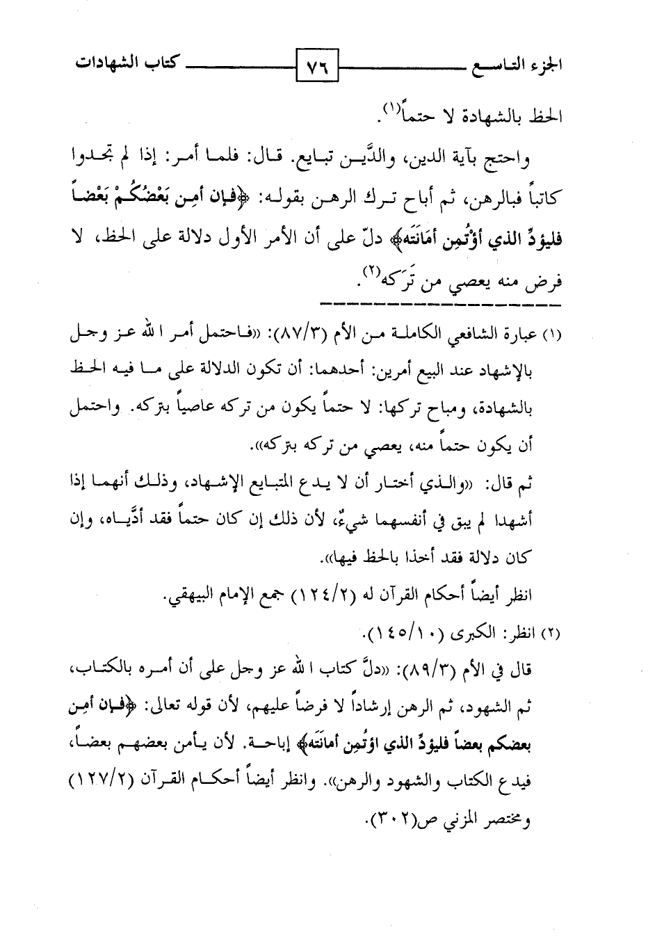 الحظ بالشهادة لا حتماً ( 1 ) . واحتج بآية الدين ، والدَّين تبايع . قال : فلما أمر : إذا لم تجدوا كاتباً فبالرهن ، ثم أباح ترك الرهن بقوله : ! ( فإن أمن بعضكم بعضا فليؤد الذي اؤتمن أمانته ) ! دلّ على أن الأمر الأول دلالة على الحظ ، لا فرض منه يعصي من تَرَكه ( 2 ) .