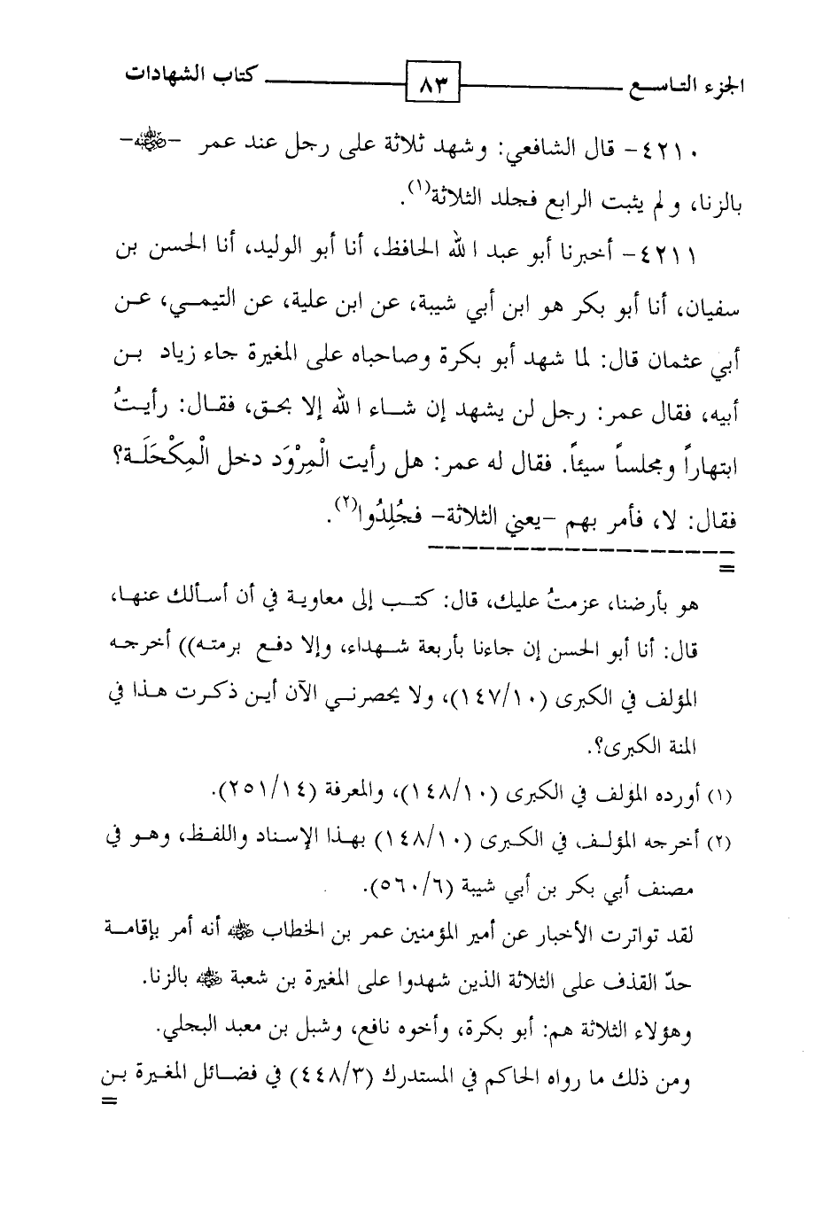 4211 - أخبرنا أبو عبد الله الحافظ ، أنا أبو الوليد ، أنا الحسن بن سفيان ، أنا أبو بكر هو ابن أبي شيبة ، عن ابن علية ، عن التيمي ، عن أبي عثمان قال : لما شهد أبو بكرة وصاحباه على المغيرة جاء زياد بن أبيه ، فقال عمر : رجل لن يشهد إن شاء الله إلا بحق ، فقال : رأيتُ ابتهاراً ومجلساً سيئاً . فقال له عمر : هل رأيت الْمِرْوَد دخل الْمِكْحَلَة ؟ فقال : لا ، فأمر بهم - يعني الثلاثة - فجُلِدُوا ( 2 ) .