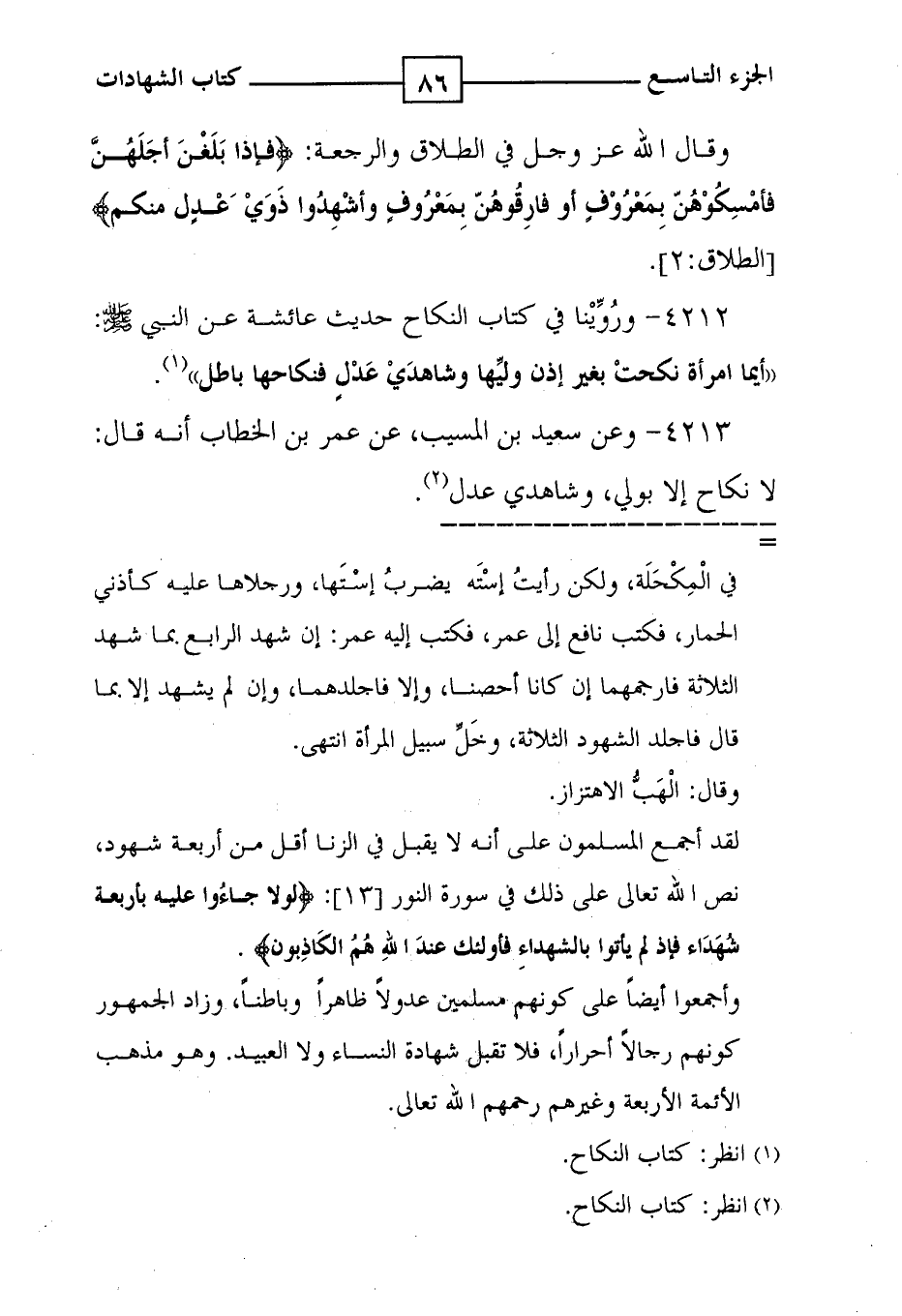 4212 - ورُوِّيْنا في كتاب النكاح حديث عائشة عن النبي ' أيما امرأة نكحتْ بغير إذن وليِّها وشاهدَيْ عَدْلٍ فنكاحها باطل ' ( 1 ) .