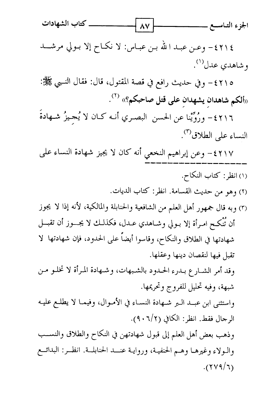 4217 - وعن إبراهيم النخعي أنه كان لا يجيز شهادة النساء على