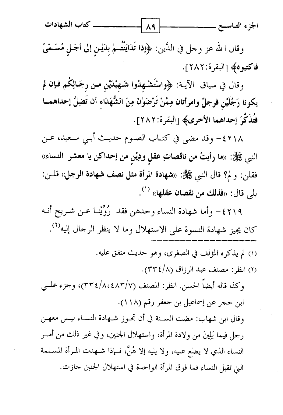 4218 - وقد مضى في كتاب الصوم حديث أبي سعيد ، عن النبي : ' ما رأيتُ من ناقصات عقلٍ ودِينْ من إحداكن يا معشر النساء ' فقلن : ولم ؟ قال النبي : ' شهادة المرأة مثل نصف شهادة الرجل ' قلن : بلى قال : ' فذلك من نقصان عقلها ' ( 1 ) .