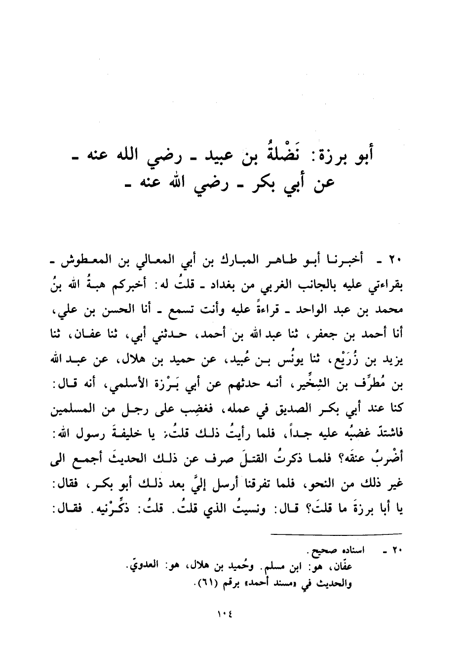 ٢٠ - أَخْبَرَنَا أَبُو طَاهِرٍ الْمُبَارَكُ بْنُ أَبِي الْمَعَالِي بْنِ الْمَعْطُوشِ - بِقِرَاءَتِي عَلَيْهِ - بِالْجَانِبِ الْغَرْبِيِّ مِنْ بَغْدَادَ - قُلْتُ لَهُ: أَخْبَرَكُمْ هِبَةُ اللهِ بْنُ مُحَمَّدِ بْنِ عَبْدِ الْوَاحِدِ - قِرَاءَةً عَلَيْهِ وَأَنْتَ تَسْمَعُ - أَنَا الْحَسَنُ بْنُ عَلِيٍّ، أَنَا أَحْمَدُ بْنُ جَعْفَرٍ، ثَنَا عَبْدُ اللهِ بْنُ أَحْمَدَ؛ حَدَّثَنِي أَبِي، ثَنَا عَفَّانُ، ثَنَا يَزِيدُ بْنُ زُرَيْعٍ، ثَنَا يُونُسُ بْنُ عُبَيْدٍ، عَنْ حُمَيْدِ بْنِ هِلَالٍ، عَنْ عَبْدِ اللهِ بْنِ مُطَرِّفِ بْنِ الشِّخِّيرِ؛ أَنَّهُ حَدَّثَهُمْ عَنْ أَبِي بَرْزَةَ الْأَسْلَمِيِّ؛ أَنَّهُ قَالَ: «كُنَّا عِنْدَ أَبِي بَكْرٍ الصِّدِّيقِ فِي عَمَلِهِ فَغَضِبَ عَلَى رَجُلٍ مِنَ الْمُسْلِمِينَ فَاشْتَدَّ غَضَبُهُ عَلَيْهِ جِدًّا، فَلَمَّا رَأَيْتُ ذَلِكَ قُلْتُ: يَا خَلِيفَةَ رَسُولِ اللهِ أَضْرِبُ عُنُقَهُ؟ فَلَمَّا ذَكَرْتُ الْقَتْلَ صَرَفَ عَنْ ذَلِكَ الْحَدِيثِ أَجْمَعَ إِلَى غَيْرِ ذَلِكَ مِنَ النَّحْوِ، فَلَمَّا تَفَرَّقْنَا أَرْسَلَ إِلَيَّ بَعْدَ ذَلِكَ أَبُو بَكْرٍ، فَقَالَ: يَا أَبَا بَرْزَةَ مَا قُلْتَ؟ قَالَ: وَنَسِيتُ الَّذِي قُلْتُ. قُلْتُ: ذَكِّرْنِيهِ، فَقَالَ: