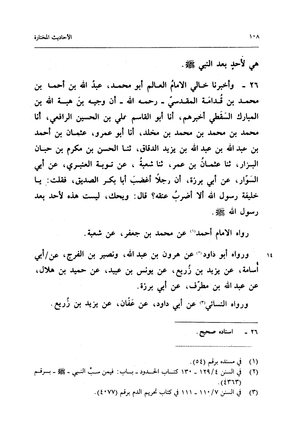 ٢٦ - وَأَخْبَرَنَا خَالِي الْإِمَامُ الْعَالِمُ أَبُو مُحَمَّدٍ، عَبْدُ اللهِ بْنُ أَحْمَدَ بْنِ مُحَمَّدِ بْنِ قُدَامَةَ الْمَقْدِسِيُّ رَحِمَهُ اللهُ أَنَّ وَجِيهَ بْنَ هِبَةِ اللهِ بْنِ الْمُبَارَكِ السَّقَطِيَّ أَخْبَرَهُمْ، أَنَا أَبُو الْقَاسِمِ عَلِيُّ بْنُ الْحُسَيْنِ الرَّافِعِيُّ، أَنَا مُحَمَّدُ بْنُ مُحَمَّدِ بْنِ مُحَمَّدِ بْنِ مَخْلَدٍ، أَنَا أَبُو عَمْرٍو، عُثْمَانُ بْنُ أَحْمَدَ بْنِ عَبْدِ اللهِ بْنِ عَبْدِ اللهِ بْنِ يَزِيدَ الدَّقَّاقُ، ثَنَا الْحَسَنُ بْنُ مُكْرَمِ بْنِ حَبَّانَ الْبَزَّارُ، ثَنَا عُثْمَانُ بْنُ عُمَرَ، ثَنَا شُعْبَةُ، عَنْ تَوْبَةَ الْعَنْبَرِيِّ، عَنْ أَبِي السَّوَّارِ، عَنْ أَبِي بَرْزَةَ «أَنَّ رَجُلًا أَغْضَبَ أَبَا بَكْرٍ الصِّدِّيقَ، فَقُلْتُ: يَا خَلِيفَةَ رَسُولِ اللهِ، أَلَا أَضْرِبُ عُنُقَهُ؟ قَالَ: وَيْحَكَ لَيْسَتْ هَذِهِ لِأَحَدٍ بَعْدَ رَسُولِ اللهِ - صَلَّى اللهُ عَلَيْهِ وَسَلَّمَ» -.