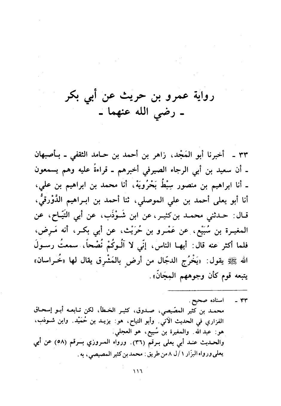 ٣٣ - أَخْبَرَنَا أَبُو الْمَجْدِ زَاهِرُ بْنُ أَحْمَدَ بْنِ حَامِدٍ الثَّقَفِيُّ - بِأَصْبَهَانَ - أَنَّ سَعِيدَ بْنَ أَبِي الرَّجَاءِ الصَّيْرَفِيَّ أَخْبَرَهُمْ قِرَاءَةً عَلَيْهِ وَهُمْ يَسْمَعُونَ، أَنَا إِبْرَاهِيمُ بْنُ مَنْصُورٍ سِبْطُ بَحْرَوَيْهِ، أَنَا مُحَمَّدُ بْنُ إِبْرَاهِيمَ بْنِ عَلِيٍّ، أَنَا أَبُو يَعْلَى أَحْمَدُ بْنُ عَلِيٍّ الْمَوْصِلِيُّ، ثَنَا أَحْمَدُ بْنُ إِبْرَاهِيمَ الدَّوْرَقِيُّ قَالَ: حَدَّثَنِي مُحَمَّدُ بْنُ كَثِيرٍ، عَنِ ابْنِ شَوْذَبٍ، عَنْ أَبِي التَّيَّاحِ، عَنِ الْمُغِيرَةِ بْنِ سُبَيْعٍ، عَنْ عَمْرِو بْنِ حُرَيْثٍ، عَنْ أَبِي بَكْرٍ، «أَنَّهُ مَرِضَ، فَلَمَّا أُكْثِرَ عَنْهُ قَالَ: أَيُّهَا النَّاسُ إِنِّي لَا آلُوكُمْ نُصْحًا، سَمِعْتُ رَسُولَ اللهِ - صَلَّى اللهُ عَلَيْهِ وَسَلَّمَ - يَقُولُ: يَخْرُجُ الدَّجَّالُ مِنْ أَرْضٍ بِالْمَشْرِقِ يُقَالُ لَهَا: خُرَاسَانُ، يَتْبَعُهُ قَوْمٌ كَأَنَّ وُجُوهَهُمُ الْمَجَانُّ».