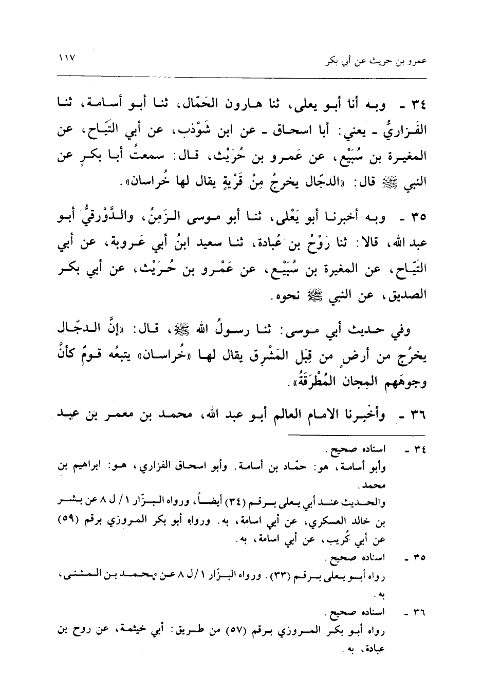 ٣٤ - وَبِهِ أَنَا أَبُو يَعْلَى، ثَنَا هَارُونُ الْحَمَّالُ، ثَنَا أَبُو أُسَامَةَ، ثَنَا الْفَزَارِيُّ - يَعْنِي أَبَا إِسْحَاقَ - عَنِ ابْنِ شَوْذَبٍ، عَنْ أَبِي التَّيَّاحِ، عَنِ الْمُغِيرَةِ بْنِ سُبَيْعٍ، عَنْ عَمْرِو بْنِ حُرَيْثٍ قَالَ: سَمِعْتُ أَبَا بَكْرٍ، عَنِ النَّبِيِّ - صَلَّى اللهُ عَلَيْهِ وَسَلَّمَ - قَالَ: «الدَّجَّالُ يَخْرُجُ مِنْ قَرْيَةٍ يُقَالُ لَهَا: خُرَاسَانُ».