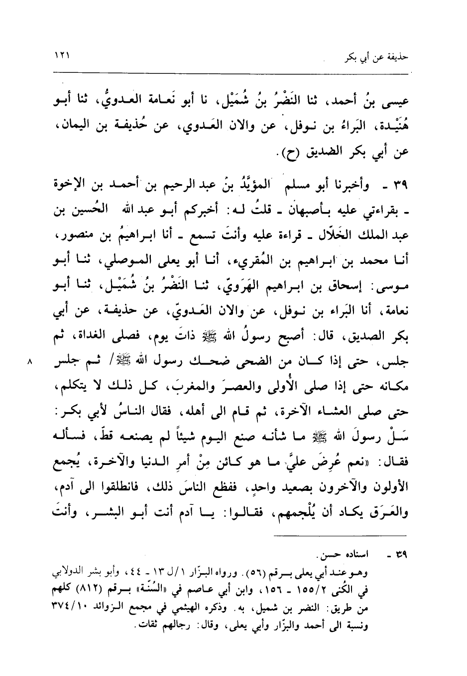 ٣٩ - وَأَخْبَرَنَا أَبُو مُسْلِمٍ الْمُؤَيَّدُ بْنُ عَبْدِ الرَّحِيمِ بْنِ أَحْمَدَ بْنِ الْإِخْوَةِ - بِقِرَاءَتِي عَلَيْهِ بِأَصْبَهَانَ - قُلْتُ لَهُ: أَخْبَرَكُمْ أَبُو عَبْدِ اللهِ الْحُسَيْنُ بْنُ عَبْدِ الْمَلِكِ الْخَلَّالُ - قِرَاءَةً عَلَيْهِ وَأَنْتَ تَسْمَعُ - أَنَا إِبْرَاهِيمُ بْنُ مَنْصُورٍ، أَنَا مُحَمَّدُ بْنُ إِبْرَاهِيمَ بْنِ الْمُقْرِئِ، أَنَا أَبُو يَعْلَى الْمَوْصِلِيُّ، ثَنَا أَبُو مُوسَى إِسْحَاقُ بْنُ إِبْرَاهِيمَ الْهَرَوِيُّ، ثَنَا النَّضْرُ بْنُ شُمَيْلٍ، ثَنَا أَبُو نَعَامَةَ، أَنَا الْبَرَاءُ بْنُ نَوْفَلٍ، عَنْ وَالَانَ الْعَدَوِيِّ، عَنْ حُذَيْفَةَ، عَنْ أَبِي بَكْرٍ الصِّدِّيقِ قَالَ: «أَصْبَحَ رَسُولُ اللهِ - صَلَّى اللهُ عَلَيْهِ وَسَلَّمَ - ذَاتَ يَوْمٍ، فَصَلَّى الْغَدَاةَ، ثُمَّ جَلَسَ، حَتَّى إِذَا كَانَ مِنَ الضُّحَى ضَحِكَ رَسُولُ اللهِ - صَلَّى اللهُ عَلَيْهِ وَسَلَّمَ - ثُمَّ جَلَسَ مَكَانَهُ حَتَّى إِذَا صَلَّى الْأُولَى، وَالْعَصْرَ، وَالْمَغْرِبَ، كُلُّ ذَلِكَ لَا يَتَكَلَّمُ، حَتَّى صَلَّى الْعِشَاءَ الْآخِرَةَ، ثُمَّ قَامَ إِلَى أَهْلِهِ، فَقَالَ النَّاسُ لِأَبِي بَكْرٍ: سَلْ رَسُولَ اللهِ - صَلَّى اللهُ عَلَيْهِ وَسَلَّمَ - مَا شَأْنُهُ صَنَعَ الْيَوْمَ شَيْئًا لَمْ يَصْنَعْهُ قَطُّ، فَسَأَلَهُ، فَقَالَ: نَعَمْ عُرِضَ عَلَيَّ مَا هُوَ كَائِنٌ مِنْ أَمْرِ الدُّنْيَا وَالْآخِرَةِ، يُجْمَعُ الْأَوَّلُونَ وَالْآخِرُونَ بِصَعِيدٍ وَاحِدٍ فَفَظِعَ النَّاسَ ذَلِكَ فَانْطَلَقُوا إِلَى آدَمَ، وَالْعَرَقُ يَكَادُ أَنْ يُلْجِمَهُمْ، فَقَالُوا: يَا آدَمُ أَنْتَ أَبُو الْبَشَرِ وَأَنْتَ