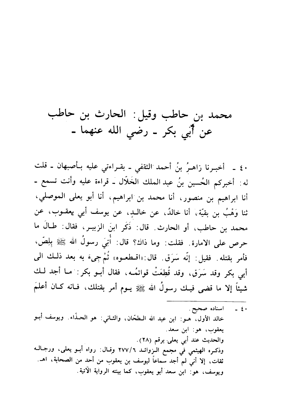 ٤٠ - أَخْبَرَنَا زَاهِرُ بْنُ أَحْمَدَ الثَّقَفِيُّ - بِقِرَاءَتِي عَلَيْهِ بِأَصْبَهَانَ - قُلْتُ لَهُ: أَخْبَرَكُمُ الْحُسَيْنُ بْنُ عَبْدِ الْمَلِكِ الْخَلَّالُ - قِرَاءَةً عَلَيْهِ وَأَنْتَ تَسْمَعُ - أَنَا إِبْرَاهِيمُ بْنُ مَنْصُورٍ، أَنَا مُحَمَّدُ بْنُ إِبْرَاهِيمَ، أَنَا أَبُو يَعْلَى الْمَوْصِلِيُّ، ثَنَا وَهْبُ بْنُ بَقِيَّةَ، أَنَا خَالِدٌ، عَنْ خَالِدٍ، عَنْ يُوسُفَ أَبِي يَعْقُوبَ، عَنْ مُحَمَّدِ بْنِ حَاطِبٍ أَوِ الْحَارِثِ قَالَ: ذُكِرَ ابْنُ الزُّبَيْرِ، فَقَالَ: «طَالَمَا حَرَصَ عَلَى الْإِمَارَةِ فَقُلْتُ: وَمَا ذَاكَ؟ قَالَ: أُتِيَ رَسُولُ اللهِ - صَلَّى اللهُ عَلَيْهِ وَسَلَّمَ - بِلِصٍّ، فَأَمَرَ بِقَتْلِهِ فَقِيلَ: إِنَّهُ سَرَقَ قَالَ: اقْطَعُوهُ، ثُمَّ جِيءَ بِهِ بَعْدَ ذَلِكَ إِلَى أَبِي بَكْرٍ وَقَدْ سَرَقَ وَقَدْ قُطِعَتْ قَوَائِمُهُ، فَقَالَ أَبُو بَكْرٍ: مَا أَجِدُ لَكَ شَيْئًا إِلَّا مَا قَضَى فِيكَ رَسُولُ اللهِ - صَلَّى اللهُ عَلَيْهِ وَسَلَّمَ - يَوْمَ أَمَرَ بِقَتْلِكَ، فَإِنَّهُ كَانَ أَعْلَمَ