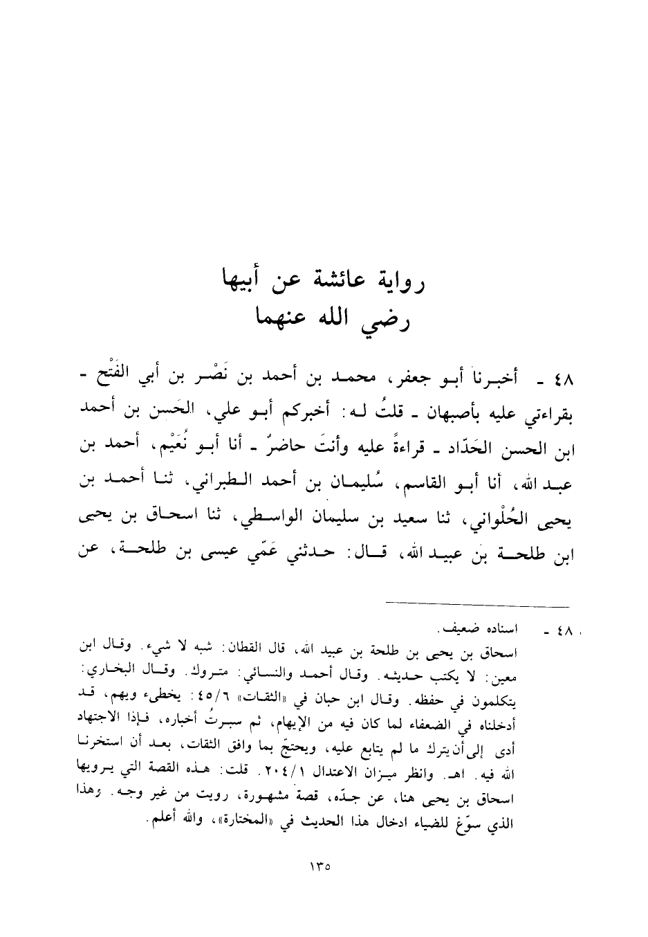 ٤٨ - أَخْبَرَنَا أَبُو جَعْفَرٍ مُحَمَّدُ بْنُ أَحْمَدَ بْنِ نَصْرِ بْنِ أَبِي الْفَتْحِ - بِقِرَاءَتِي عَلَيْهِ بِأَصْبَهَانَ - قُلْتُ لَهُ: أَخْبَرَكُمْ أَبُو عَلِيٍّ الْحَسَنُ بْنُ أَحْمَدَ بْنِ الْحَسَنِ الْحَدَّادُ - قِرَاءَةً عَلَيْهِ وَأَنْتَ حَاضِرٌ - أَنَا أَبُو نُعَيْمٍ أَحْمَدُ بْنُ عَبْدِ اللهِ، أَنَا أَبُو الْقَاسِمِ سُلَيْمَانُ بْنُ أَحْمَدَ الطَّبَرَانِيُّ، ثَنَا أَحْمَدُ بْنُ يَحْيَى الْحُلْوَانِيُّ، ثَنَا سَعِيدُ بْنُ سُلَيْمَانَ الْوَاسِطِيُّ، ثَنَا إِسْحَاقُ بْنُ يَحْيَى بْنِ طَلْحَةَ بْنِ عُبَيْدِ اللهِ قَالَ: حَدَّثَنِي عَمِّي عِيسَى بْنُ طَلْحَةَ، عَنْ