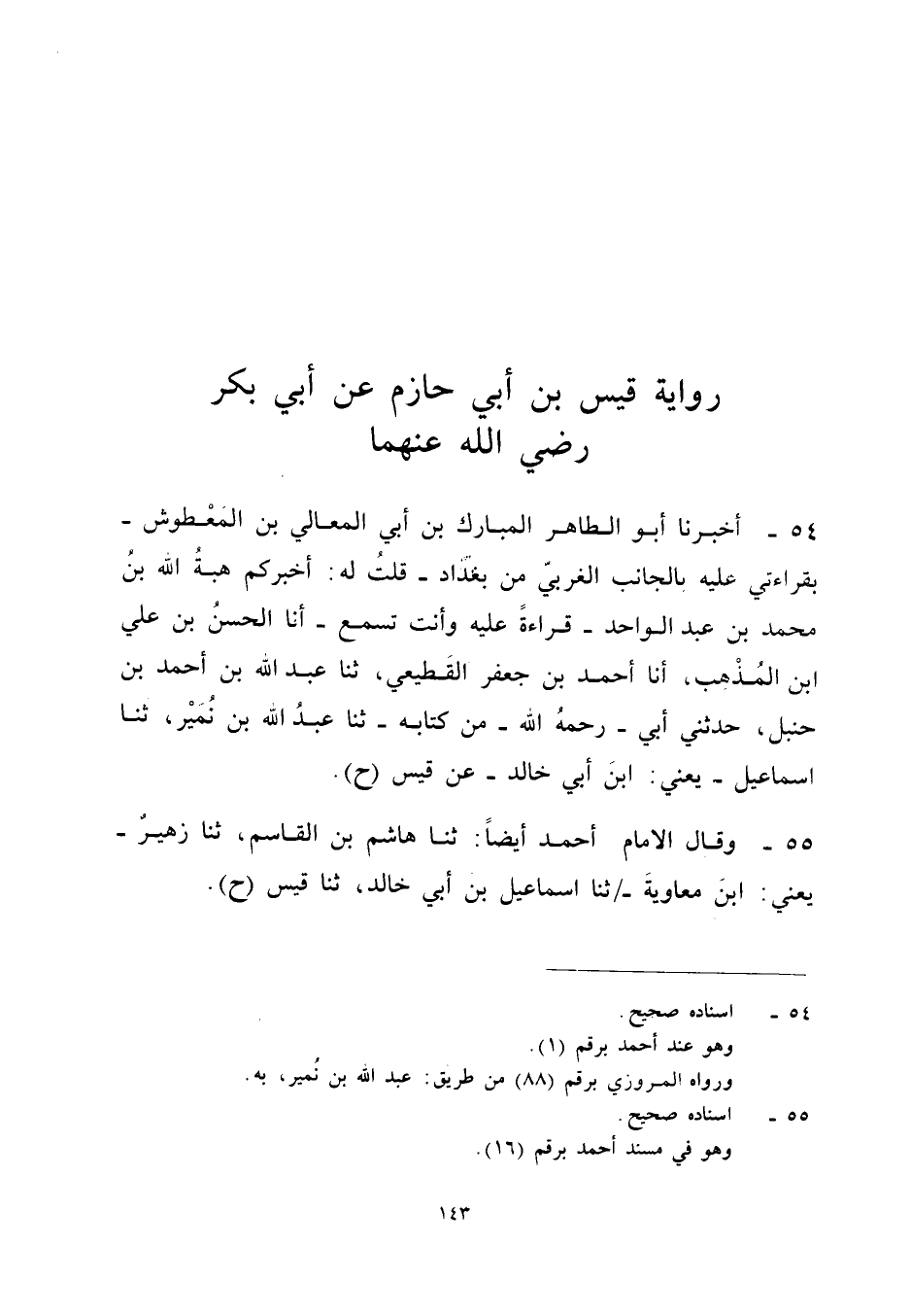 ٥٤ - أَخْبَرَنَا أَبُو الطَّاهِرِ الْ ُبَارَكُ بْنُ أَبِي الْمَعَالِي بْنِ الْمَعْطُوشِ - بِقِرَاءَتِي عَلَيْهِ بِالْجَانِبِ الْغَرْبِيِّ مِنْ بَغْدَادَ - قُلْتُ لَهُ: أَخْبَرَكُمْ هِبَةُ اللهِ بْنُ مُحَمَّدِ بْنِ عَبْدِ الْوَاحِدِ - قِرَاءَةً عَلَيْهِ وَأَنْتَ تَسْمَعُ - أَنَا الْحَسَنُ بْنُ عَلِيِّ بْنِ الْمُذْهِبِ، أَنَا أَحْمَدُ بْنُ جَعْفَرٍ الْقَطِيعِيُّ، ثَنَا عَبْدُ اللهِ بْنُ أَحْمَدَ بْنِ حَنْبَلٍ حَدَّثَنِي أَبِي - رَحِمَهُ اللهُ مِنْ كِتَابِهِ - ثَنَا عَبْدُ اللهِ بْنُ نُمَيْرٍ، ثَنَا إِسْمَاعِيلُ - يَعْنِي: ابْنَ أَبِي خَالِدٍ - عَنْ قَيْسٍ (ح).