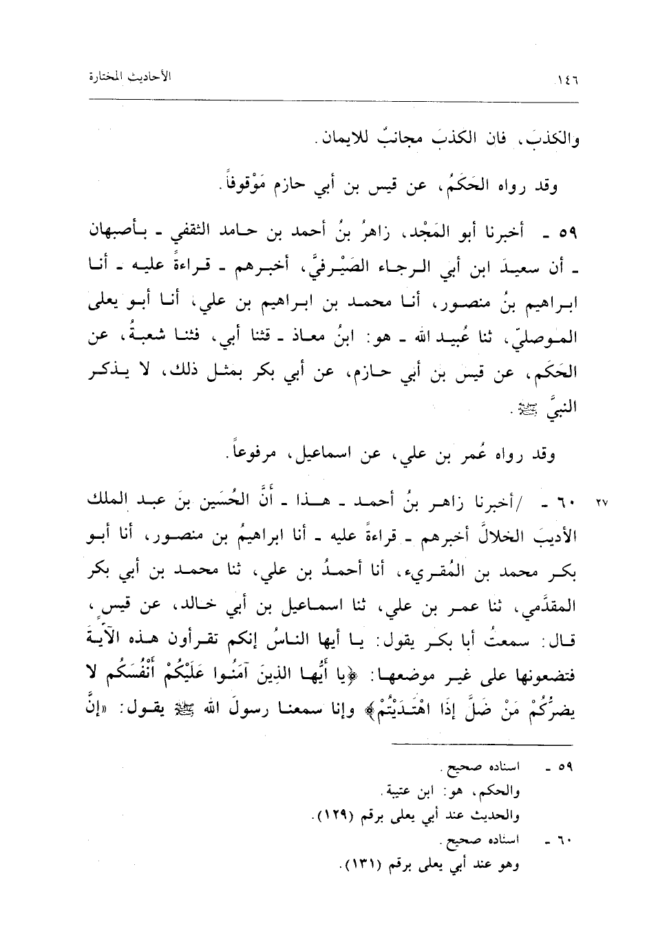 ٥٩ - أَخْبَرَنَا أَبُو الْمَجْدِ، زَاهِرُ بْنُ أَحْمَدَ بْنِ حَامِدٍ الثَّقَفِيُّ - بِأَصْبَهَانَ - أَنَّ سَعِيدَ بْنَ أَبِي الرَّجَاءِ الصَّيْرَفِيَّ، أَخْبَرَهُمْ - قِرَاءَةً عَلَيْهِ - أَنَا إِبْرَاهِيمُ بْنُ مَنْصُورٍ، أَنَا مُحَمَّدُ بْنُ إِبْرَاهِيمَ بْنِ عَلِيٍّ، أَنَا أَبُو يَعْلَى الْمَوْصِلِيُّ، ثَنَا عُبَيْدُ اللهِ هُوَ ابْنُ مُعَاذٍ، قَثَنَا أَبِي، قَثَنَا شُعْبَةُ، عَنِ الْحَكَمِ، عَنْ قَيْسِ بْنِ أَبِي حَازِمٍ، عَنْ أَبِي بَكْرٍ بِمِثْلِ ذَلِكَ، لَا يَذْكُرُ النَّبِيَّ - صَلَّى اللهُ عَلَيْهِ وَسَلَّمَ -.