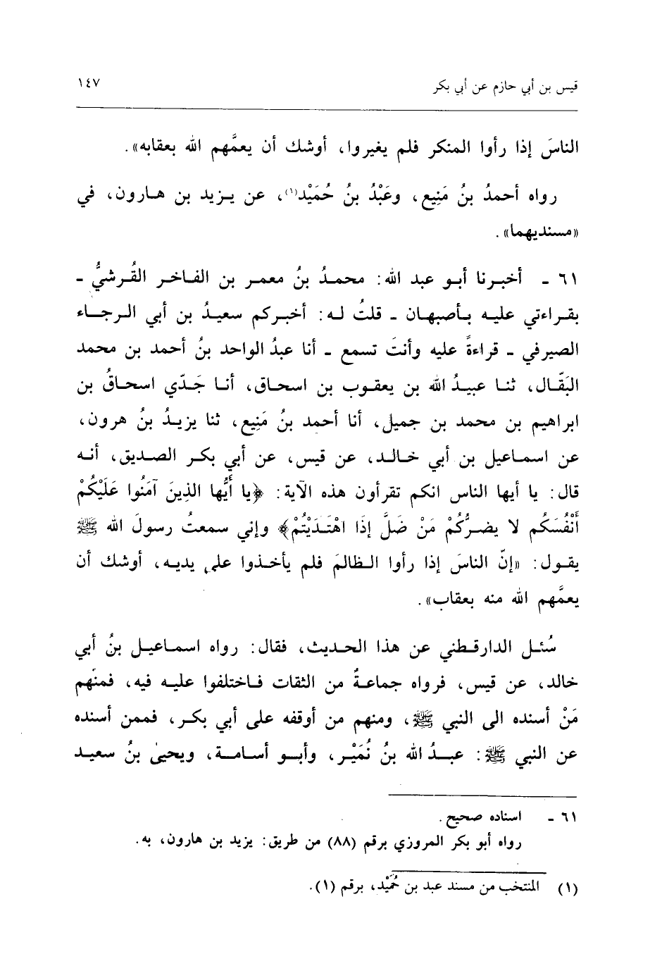 ٦١ - أَخْبَرَنَا أَبُو عَبْدِ اللهِ مُحَمَّدُ بْنُ مَعْمَرِ بْنِ الْفَاخِرِ الْقُرَشِيُّ - بِقِرَاءَتِي عَلَيْهِ بِأَصْبَهَانَ - قُلْتُ لَهُ: أَخْبَرَكُمْ سَعِيدُ بْنُ أَبِي الرَّجَاءِ الصَّيْرَفِيُّ - قِرَاءَةً عَلَيْهِ وَأَنْتَ تَسْمَعُ - أَنَا عَبْدُ الْوَاحِدِ بْنُ أَحْمَدَ بْنِ مُحَمَّدٍ الْبَقَّالُ، ثَنَا عُبَيْدُ اللهِ بْنُ يَعْقُوبَ بْنِ إِسْحَاقَ، أَنَا جَدِّي إِسْحَاقُ بْنُ إِبْرَاهِيمَ بْنِ مُحَمَّدِ بْنِ جَمِيلٍ، أَنَا أَحْمَدُ بْنُ مَنِيعٍ، ثَنَا يَزِيدُ بْنُ هَارُونَ، عَنْ إِسْمَاعِيلَ بْنِ أَبِي خَالِدٍ، عَنْ قَيْسٍ، عَنْ أَبِي بَكْرٍ الصِّدِّيقِ، أَنَّهُ قَالَ: «يَا أَيُّهَا النَّاسُ إِنَّكُمْ تَقْرَءُونَ هَذِهِ الْآيَةَ: {يَا أَيُّهَا الَّذِينَ آمَنُوا عَلَيْكُمْ أَنْفُسَكُمْ لا يَضُرُّكُمْ مَنْ ضَلَّ إِذَا اهْتَدَيْتُمْ} وَإِنِّي سَمِعْتُ رَسُولَ اللهِ - صَلَّى اللهُ عَلَيْهِ وَسَلَّمَ - يَقُولُ: إِنَّ النَّاسَ إِذَا رَأَوُا الظَّالِمَ فَلَمْ يَأْخُذُوا عَلَى يَدَيْهِ أَوْشَكَ أَنْ يَعُمَّهُمُ اللهُ مِنْهُ بِعِقَابٍ».