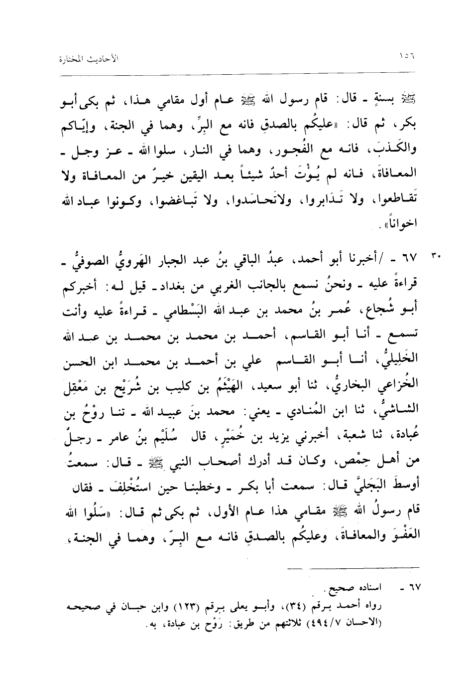 ٦٧ - أَخْبَرَنَا أَبُو أَحْمَدَ عَبْدُ الْبَاقِي بْنُ عَبْدِ الْجَبَّارِ الْهَرَوِيُّ الصُّوفِيُّ - قِرَاءَةً عَلَيْهِ وَنَحْنُ نَسْمَعُ بِالْجَانِبِ الْغَرْبِيِّ مِنْ بَغْدَادَ - قِيلَ لَهُ: أَخْبَرَكُمْ أَبُو شُجَاعٍ، عُمَرُ بْنُ مُحَمَّدِ بْنِ عَبْدِ اللهِ الْبِسْطَامِيُّ - قِرَاءَةً عَلَيْهِ وَأَنْتَ تَسْمَعُ - أَنَا أَبُو الْقَاسِمِ أَحْمَدُ بْنُ مُحَمَّدِ بْنِ مُحَمَّدِ بْنِ عَبْدِ اللهِ الْخَلِيلِيُّ، أَنَا أَبُو الْقَاسِمِ عَلِيُّ بْنُ أَحْمَدَ بْنِ مُحَمَّدِ بْنِ الْحَسَنِ الْخُزَاعِيُّ الْبُخَارِيُّ، ثَنَا أَبُو سَعِيدٍ الْهَيْثَمُ بْنُ كُلَيْبِ بْنِ شُرَيْحِ بْنِ مَعْقِلٍ الشَّاشِيُّ، ثَنَا ابْنُ الْمُنَادِي - يَعْنِي مُحَمَّدَ بْنَ عُبَيْدِ اللهِ - ثَنَا رَوْحُ بْنُ عُبَادَةَ، ثَنَا شُعْبَةُ، أَخْبَرَنِي يَزِيدُ بْنُ خُمَيْرٍ قَالَ: سَلِيمُ بْنُ عَامِرٍ رَجُلٌ مِنْ أَهْلِ حِمْصَ، وَكَانَ قَدْ أَدْرَكَ أَصْحَابَ النَّبِيِّ - صَلَّى اللهُ عَلَيْهِ وَسَلَّمَ - قَالَ: سَمِعْتُ أَوْسَطَ الْبَجَلِيَّ قَالَ: «سَمِعْتُ أَبَا بَكْرٍ وَخَطَبَنَا حِينَ اسْتُخْلِفَ، فَقَالَ: قَامَ رَسُولُ اللهِ - صَلَّى اللهُ عَلَيْهِ وَسَلَّمَ - مَقَامِي هَذَا عَامَ الْأَوَّلِ، ثُمَّ بَكَى، ثُمَّ قَالَ: سَلُوا اللهَ الْعَفْوَ وَالْمُعَافَاةَ، وَعَلَيْكُمْ بِالصِّدْقِ فَإِنَّهُ مَعَ الْبِرِّ وَهُمَا فِي الْجَنَّةِ،