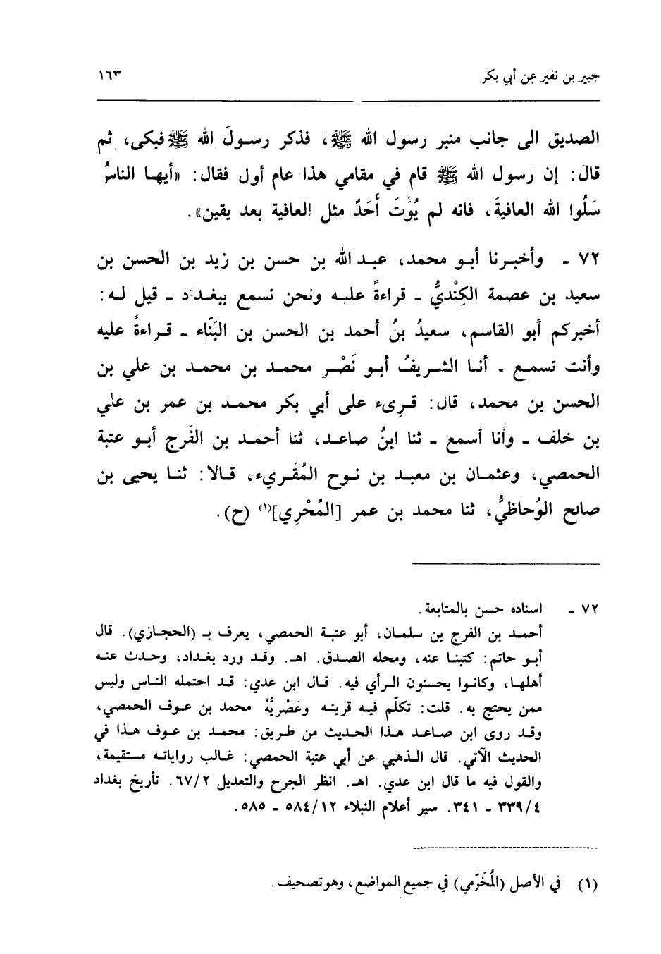 ٧٢ - وَأَخْبَرَنَا أَبُو مُحَمَّدٍ عَبْدُ اللهِ بْنُ حَسَنِ بْنِ زَيْدِ بْنِ الْحَسَنِ بْنِ سَعِيدِ بْنِ عِصْمَةَ الْكِنْدِيُّ - قِرَاءَةً عَلَيْهِ وَنَحْنُ نَسْمَعُ بِبَغْدَادَ - قِيلَ لَهُ: أَخْبَرَكُمْ أَبُو الْقَاسِمِ سَعِيدُ بْنُ أَحْمَدَ بْنِ الْحَسَنِ بْنِ الْبَنَّاءِ - قِرَاءَةً عَلَيْهِ وَأَنْتَ تَسْمَعُ - أَنَا الشَّرِيفُ أَبُو نَصْرٍ مُحَمَّدُ بْنُ مُحَمَّدِ بْنِ عَلِيِّ بْنِ الْحَسَنِ بْنِ مُحَمَّدٍ، قَالَ: قُرِئَ عَلَى أَبِي بَكْرٍ مُحَمَّدِ بْنِ عُمَرَ بْنِ عَلِيِّ بْنِ خَلَفٍ - وَأَنَا أَسْمَعُ - ثَنَا ابْنُ صَاعِدٍ، ثَنَا أَحْمَدُ بْنُ الْفَرَجِ أَبُو عُتْبَةَ الْحِمْصِيُّ، وَعُثْمَانُ بْنُ مَعْبَدِ بْنِ نُوحٍ الْمُقْرِئُ، قَالَا: ثَنَا يَحْيَى بْنُ صَالِحٍ الْوُحَاظِيُّ، ثَنَا مُحَمَّدُ بْنُ عُمَرَ [الْمُحْرِيُّ] (ح).