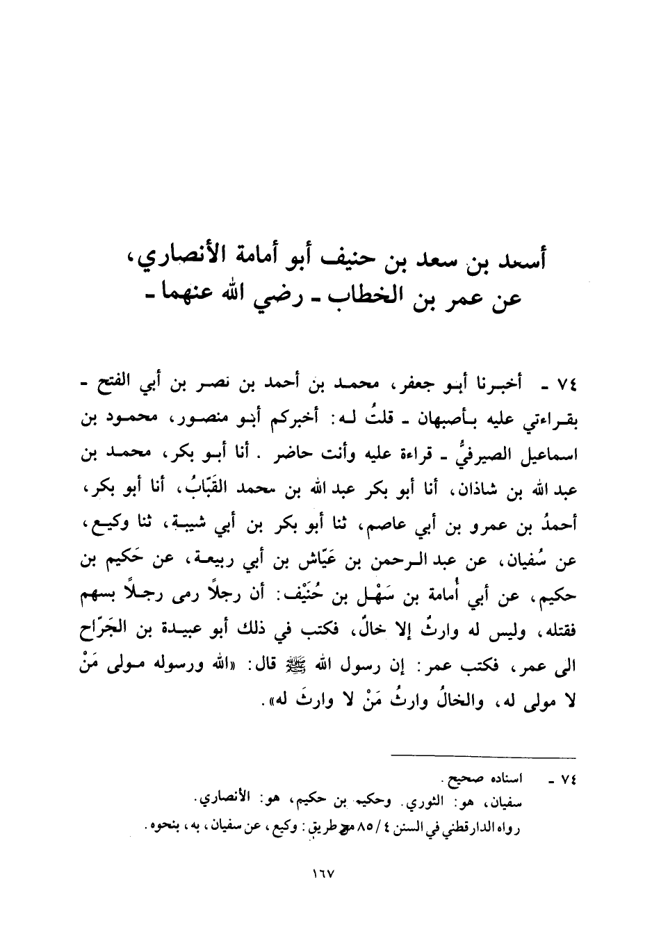 ٧٤ - أَخْبَرَنَا أَبُو جَعْفَرٍ مُحَمَّدُ بْنُ أَحْمَدَ بْنِ نَصْرِ بْنِ أَبِي الْفَتْحِ - بِقِرَاءَتِي عَلَيْهِ بِأَصْبَهَانَ - قُلْتُ لَهُ: أَخْبَرَكُمْ أَبُو مَنْصُورٍ مَحْمُودُ بْنُ إِسْمَاعِيلَ الصَّيْرَفِيُّ - قِرَاءَةً عَلَيْهِ وَأَنْتَ حَاضِرٌ - أَنَا أَبُو بَكْرٍ مُحَمَّدُ بْنُ عَبْدِ اللهِ بْنِ شَاذَانَ، أَنَا أَبُو بَكْرٍ عَبْدُ اللهِ بْنُ مُحَمَّدٍ الْقَبَّابُ، أَنَا أَبُو بَكْرٍ أَحْمَدُ بْنُ عَمْرِو بْنِ أَبِي عَاصِمٍ، ثَنَا أَبُو بَكْرِ بْنُ أَبِي شَيْبَةَ، ثَنَا وَكِيعٌ، عَنْ سُفْيَانَ، عَنْ عَبْدِ الرَّحْمَنِ بْنِ عَيَّاشِ بْنِ أَبِي رَبِيعَةَ، عَنْ حَكِيمِ بْنِ حَكِيمٍ، عَنْ أَبِي أُمَامَةَ بْنِ سَهْلِ بْنِ حُنَيْفٍ: «أَنَّ رَجُلًا رَمَى رَجُلًا بِسَهْمٍ فَقَتَلَهُ وَلَيْسَ لَهُ وَارِثٌ إِلَّا خَالٌ، فَكَتَبَ فِي ذَلِكَ أَبُو عُبَيْدَةَ بْنُ الْجَرَّاحِ إِلَى عُمَرَ فَكَتَبَ عُمَرُ: إِنَّ رَسُولَ اللهِ - صَلَّى اللهُ عَلَيْهِ وَسَلَّمَ - قَالَ: اللهُ وَرَسُولُهُ مَوْلَى مَنْ لَا مَوْلَى لَهُ وَالْخَالُ وَارِثُ مَنْ لَا وَارِثَ لَهُ».