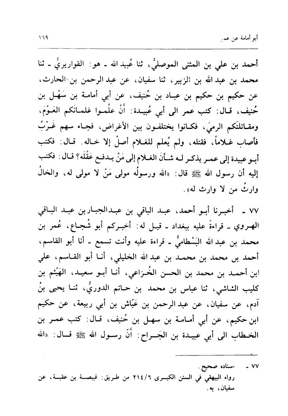 ٧٧ - أَخْبَرَنَا أَبُو أَحْمَدَ عَبْدُ الْبَاقِي بْنُ عَبْدِ الْجَبَّارِ بْنِ عَبْدِ الْبَاقِي الْهَرَوِيُّ - قِرَاءَةً عَلَيْهِ بِبَغْدَادَ - قِيلَ لَهُ: أَخْبَرَكُمْ أَبُو شُجَاعٍ عُمَرُ بْنُ مُحَمَّدِ بْنِ عَبْدِ اللهِ الْبِسْطَامِيُّ - قِرَاءَةً عَلَيْهِ وَأَنْتَ تَسْمَعُ - أَنَا أَبُو الْقَاسِمِ أَحْمَدُ بْنُ مُحَمَّدِ بْنِ مُحَمَّدِ بْنِ عَبْدِ اللهِ الْخَلِيلِيُّ، أَنَا أَبُو الْقَاسِمِ عَلِيُّ بْنُ أَحْمَدَ بْنِ مُحَمَّدِ بْنِ الْحَسَنِ الْخُزَاعِيُّ، أَنَا أَبُو سَعِيدٍ الْهَيْثَمُ بْنُ كُلَيْبٍ الشَّاشِيُّ، ثَنَا عَبَّاسُ بْنُ مُحَمَّدِ بْنِ حَاتِمٍ الدُّورِيُّ، ثَنَا يَحْيَى بْنُ آدَمَ، عَنْ سُفْيَانَ، عَنْ عَبْدِ الرَّحْمَنِ بْنِ عَيَّاشِ بْنِ أَبِي رَبِيعَةَ، عَنْ حَكِيمِ بْنِ حَكِيمٍ، عَنْ أَبِي أُمَامَةَ بْنِ سَهْلِ بْنِ حُنَيْفٍ قَالَ: «كَتَبَ عُمَرُ بْنُ الْخَطَّابِ إِلَى أَبِي عُبَيْدَةَ بْنِ الْجَرَّاحِ: أَنَّ رَسُولَ اللهِ - صَلَّى اللهُ عَلَيْهِ وَسَلَّمَ - قَالَ: اللهُ