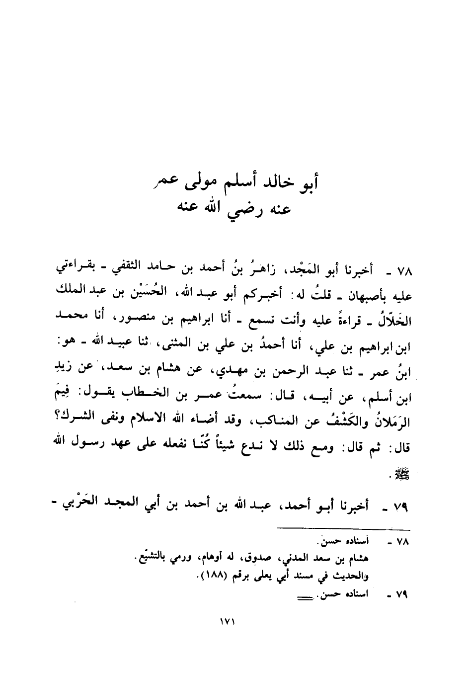 ٧٨ - أَخْبَرَنَا أَبُو الْمَجْدِ زَاهِرُ بْنُ أَحْمَدَ بْنِ حَامِدٍ الثَّقَفِيُّ - بِقِرَاءَتِي عَلَيْهِ بِأَصْبَهَانَ - قُلْتُ لَهُ: أَخْبَرَكُمْ أَبُو عَبْدِ اللهِ الْحُسَيْنُ بْنُ عَبْدِ الْمَلِكِ الْخَلَّالُ - قِرَاءَةً عَلَيْهِ وَأَنْتَ تَسْمَعُ - أَنَا إِبْرَاهِيمُ بْنُ مَنْصُورٍ، أَنَا مُحَمَّدُ بْنُ إِبْرَاهِيمَ بْنِ عَلِيٍّ، أَنَا أَحْمَدُ بْنُ عَلِيِّ بْنِ الْمُثَنَّى، ثَنَا عُبَيْدُ اللهِ - هُوَ: ابْنُ عُمَرَ - ثَنَا عَبْدُ الرَّحْمَنِ بْنُ مَهْدِيٍّ، عَنْ هِشَامِ بْنِ سَعْدٍ، عَنْ زَيْدِ بْنِ أَسْلَمَ عَنْ أَبِيهِ قَالَ: سَمِعْتُ عُمَرَ بْنَ الْخَطَّابِ يَقُولُ: «فِيمَ الرَّمَلَانُ، وَالْكَشْفُ عَنِ الْمَنَاكِبِ، وَقَدْ أَضَاءَ اللهُ الْإِسْلَامَ وَنَفَى الشِّرْكَ؟ قَالَ: ثُمَّ قَالَ: وَمَعَ ذَلِكَ لَا نَدَعُ شَيْئًا كُنَّا نَفْعَلُهُ عَلَى عَهْدِ رَسُولِ اللهِ - صَلَّى اللهُ عَلَيْهِ وَسَلَّمَ» -.