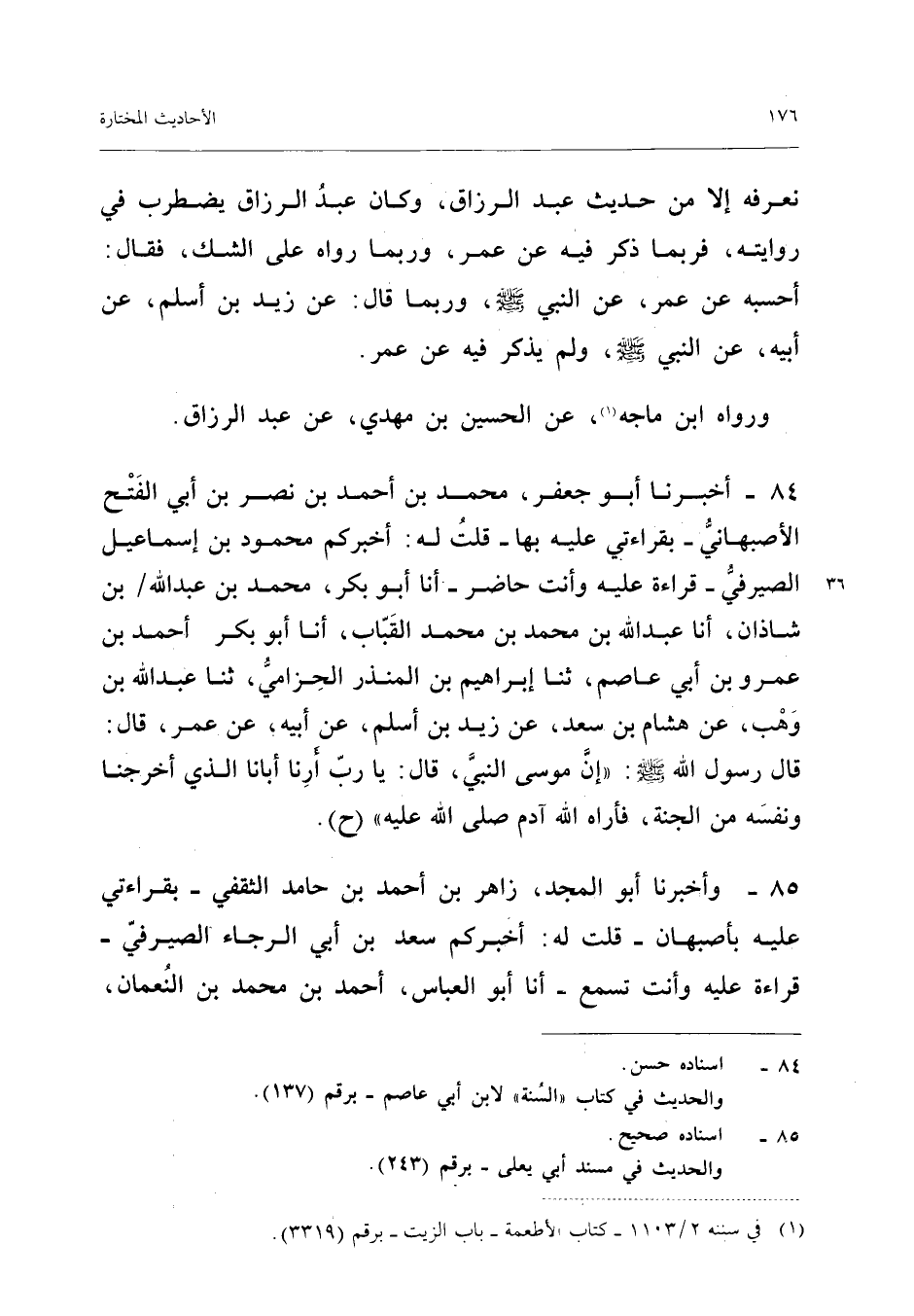 ٨٤ - أَخْبَرَنَا أَبُو جَعْفَرٍ مُحَمَّدُ بْنُ أَحْمَدَ بْنِ نَصْرِ بْنِ أَبِي الْفَتْحِ الْأَصْبَهَانِيُّ - بِقِرَاءَتِي عَلَيْهِ بِهَا - قُلْتُ لَهُ: أَخْبَرَكُمْ مَحْمُودُ بْنُ إِسْمَاعِيلَ الصَّيْرَفِيُّ - قِرَاءَةً عَلَيْهِ وَأَنْتَ حَاضِرٌ - أَنَا أَبُو بَكْرٍ مُحَمَّدُ بْنُ عَبْدِ اللهِ بْنِ شَاذَانَ، أَنَا عَبْدُ اللهِ بْنُ مُحَمَّدِ بْنِ مُحَمَّدٍ الْقَبَّابُ، أَنَا أَبُو بَكْرٍ أَحْمَدُ بْنُ عَمْرِو بْنِ أَبِي عَاصِمٍ، ثَنَا إِبْرَاهِيمُ بْنُ الْمُنْذِرِ الْحِزَامِيُّ، ثَنَا عَبْدُ اللهِ بْنُ وَهْبٍ، عَنْ هِشَامِ بْنِ سَعْدٍ، عَنْ زَيْدِ بْنِ أَسْلَمَ، عَنْ أَبِيهِ، عَنْ عُمَرَ قَالَ: قَالَ رَسُولُ اللهِ - صَلَّى اللهُ عَلَيْهِ وَسَلَّمَ -: «إِنَّ مُوسَى النَّبِيَّ، قَالَ: يَا رَبِّ أَرِنَا أَبَانَا الَّذِي أَخْرَجَنَا وَنَفْسَهُ مِنَ الْجَنَّةِ فَأَرَاهُ اللهُ آدَمَ صَلَّى اللهُ عَلَيْهِ» (ح).