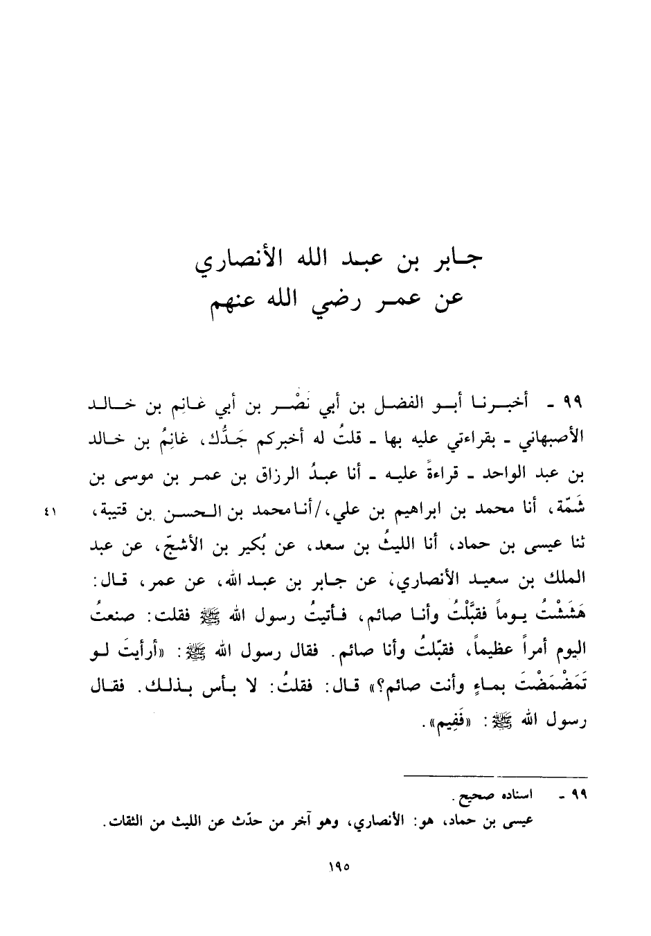 ٩٩ - أَخْبَرَنَا أَبُو الْفَضْلِ بْنُ أَبِي نَصْرِ بْنِ أَبِي غَانِمِ بْنِ خَالِدٍ الْأَصْبَهَانِيُّ - بِقِرَاءَتِي عَلَيْهِ بِهَا - قُلْتُ لَهُ: أَخْبَرَكُمْ جَدُّكَ غَانِمُ بْنُ خَالِدِ بْنِ عَبْدِ الْوَاحِدِ - قِرَاءَةً عَلَيْهِ - أَنَا عَبْدُ الرَّزَّاقِ بْنُ عُمَرَ بْنِ مُوسَى بْنِ شَمَّةَ، أَنَا مُحَمَّدُ بْنُ إِبْرَاهِيمَ بْنِ عَلِيٍّ، أَنَا مُحَمَّدُ بْنُ الْحَسَنِ بْنِ قُتَيْبَةَ، ثَنَا عِيسَى بْنُ حَمَّادٍ، أَنَا اللَّيْثُ بْنُ سَعْدٍ، عَنْ بُكَيْرِ بْنِ الْأَشَجِّ، عَنْ عَبْدِ الْمَلِكِ بْنِ سَعِيدٍ الْأَنْصَارِيِّ، عَنْ جَابِرِ بْنِ عَبْدِ اللهِ، عَنْ عُمَرَ، قَالَ: «هَشِشْتُ يَوْمًا فَقَبَّلْتُ وَأَنَا صَائِمٌ، فَأَتَيْتُ رَسُولَ اللهِ - صَلَّى اللهُ عَلَيْهِ وَسَلَّمَ - فَقُلْتُ: صَنَعْتُ الْيَوْمَ أَمْرًا عَظِيمًا، فَقَبَّلْتُ وَأَنَا صَائِمٌ، فَقَالَ رَسُولُ اللهِ - صَلَّى اللهُ عَلَيْهِ وَسَلَّمَ -: أَرَأَيْتَ لَوْ تَمَضْمَضْتَ بِمَاءٍ وَأَنْتَ صَائِمٌ قَالَ: فَقُلْتُ: لَا بَأْسَ بِذَلِكَ، فَقَالَ رَسُولُ اللهِ - صَلَّى اللهُ عَلَيْهِ وَسَلَّمَ -: فَفِيمَ.»
