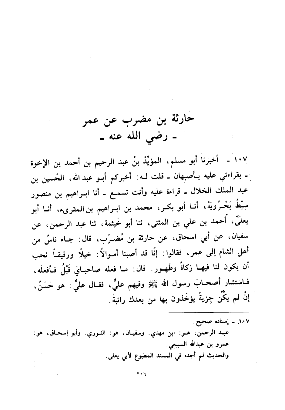 ١٠٧ - أَخْبَرَنَا أَبُو مُسْلِمٍ الْمُؤَيَّدُ بْنُ عَبْدِ الرَّحِيمِ بْنِ أَحْمَدَ بْنِ الْإِخْوَةِ - بِقِرَاءَتِي عَلَيْهِ بِأَصْبَهَانَ - قُلْتُ لَهُ: أَخْبَرَكُمْ أَبُو عَبْدِ اللهِ الْحُسَيْنُ بْنُ عَبْدِ الْمَلِكِ الْخَلَّالُ - قِرَاءَةً عَلَيْهِ وَأَنْتَ تَسْمَعُ - أَنَا إِبْرَاهِيمُ بْنُ مَنْصُورٍ سِبْطُ بَحْرَوَيْهِ، أَنَا أَبُو بَكْرٍ مُحَمَّدُ بْنُ إِبْرَاهِيمَ بْنِ الْمُقْرِئِ، أَنَا أَبُو يَعْلَى أَحْمَدُ بْنُ عَلِيِّ بْنِ الْمُثَنَّى، ثَنَا أَبُو خَيْثَمَةَ، ثَنَا عَبْدُ الرَّحْمَنِ، عَنْ سُفْيَانَ، عَنْ أَبِي إِسْحَاقَ، عَنْ حَارِثَةَ بْنِ مُضَرِّبٍ قَالَ: «جَاءَ نَاسٌ مِنْ أَهْلِ الشَّامِ إِلَى عُمَرَ، فَقَالُوا: إِنَّا قَدْ أَصَبْنَا أَمْوَالًا: خَيْلًا وَرَقِيقًا نُحِبُّ أَنْ يَكُونَ لَنَا فِيهَا زَكَاةٌ وَطَهُورٌ. قَالَ: مَا فَعَلَهُ صَاحِبَايَ قَبْلُ فَأَفْعَلُهُ، فَاسْتَشَارَ أَصْحَابَ رَسُولِ اللهِ - صَلَّى اللهُ عَلَيْهِ وَسَلَّمَ - وَفِيهِمْ عَلِيٌّ، فَقَالَ عَلِيٌّ: هُوَ حَسَنٌ إِنْ لَمْ يَكُنْ جِزْيَةً يُؤْخَذُونَ بِهَا مِنْ بَعْدِكَ رَاتِبَةً».