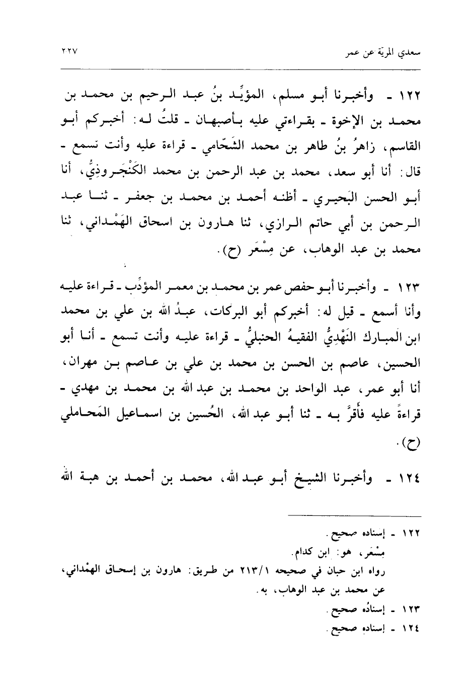 ١٢٣ - وَأَخْبَرَنَا أَبُو حَفْصٍ عُمَرُ بْنُ مُحَمَّدِ بْنِ مَعْمَرٍ الْمُؤَدِّبُ - قِرَاءَةً عَلَيْهِ وَأَنَا أَسْمَعُ - قِيلَ لَهُ: أَخْبَرَكُمْ أَبُو الْبَرَكَاتِ عَبْدُ اللهِ بْنُ عَلِيِّ بْنِ مُحَمَّدِ بْنِ الْمُبَارَكِ النَّهْدِيُّ (¬١) الْفَقِيهُ الْحَنْبَلِيُّ - قِرَاءَةً عَلَيْهِ وَأَنْتَ تَسْمَعُ - أَنَا أَبُو الْحُسَيْنِ عَاصِمُ بْنُ الْحَسَنِ بْنِ مُحَمَّدِ بْنِ عَلِيِّ بْنِ عَاصِمِ بْنِ مِهْرَانَ، أَنَا أَبُو عُمَرَ عَبْدُ الْوَاحِدِ بْنُ مُحَمَّدِ بْنِ عَبْدِ اللهِ بْنِ مُحَمَّدِ بْنِ مَهْدِيٍّ - قِرَاءَةً عَلَيْهِ فَأَقَرَّ بِهِ - ثَنَا أَبُو عَبْدِ اللهِ الْحُسَيْنُ بْنُ إِسْمَاعِيلَ الْمَحَامِلِيُّ (ح).