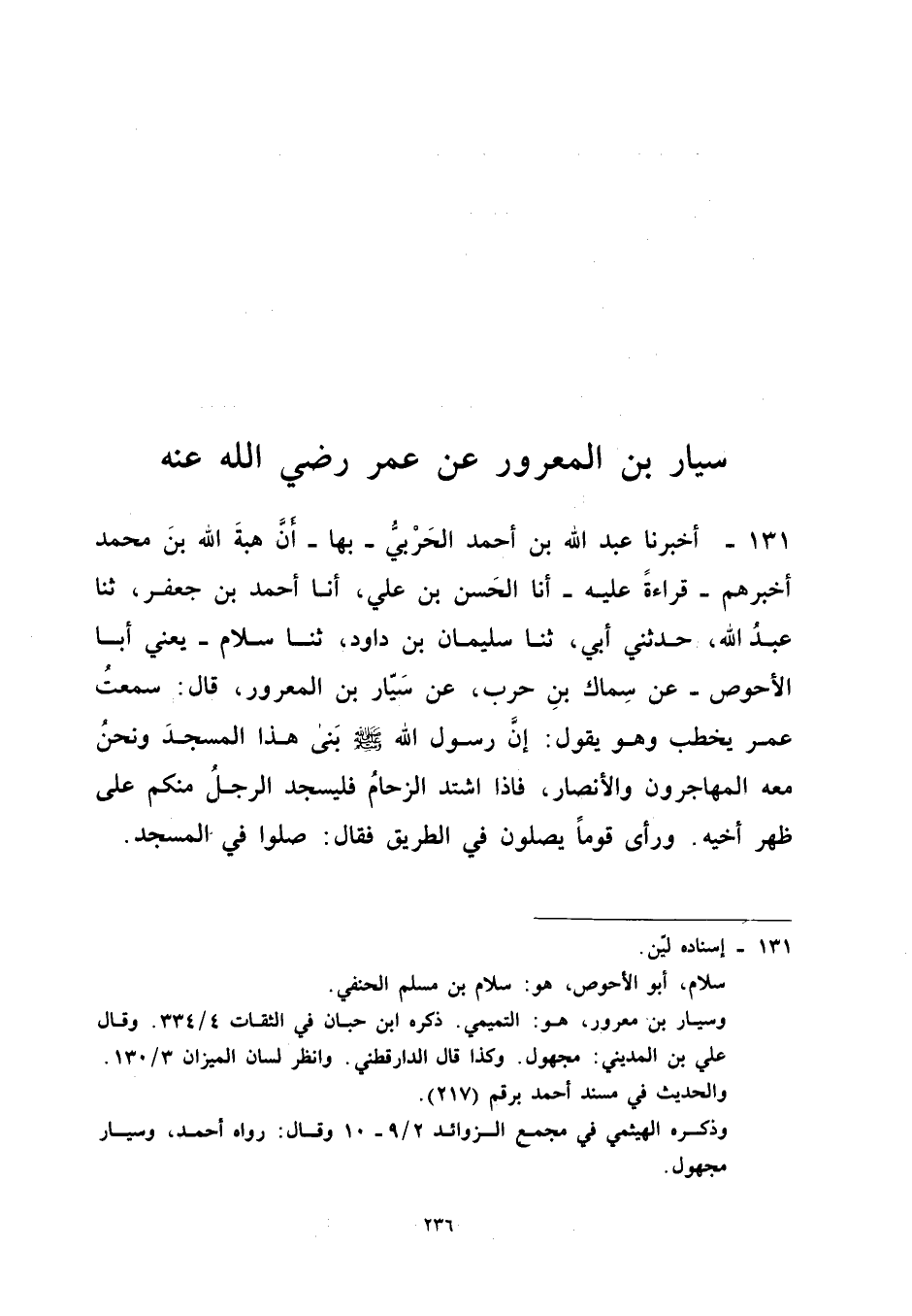 ١٣١ - أَخْبَرَنَا عَبْدُ اللهِ بْنُ أَحْمَدَ الْحَرْبِيُّ بِهَا أَنَّ هِبَةَ اللهِ بْنَ مُحَمَّدٍ أَخْبَرَهُمْ - قِرَاءَةً عَلَيْهِ - أَنَا الْحَسَنُ بْنُ عَلِيٍّ، أَنَا أَحْمَدُ بْنُ جَعْفَرٍ، ثَنَا عَبْدُ اللهِ، حَدَّثَنِي أَبِي، ثَنَا سُلَيْمَانُ بْنُ دَاوُدَ، ثَنَا سَلَّامٌ - يَعْنِي أَبَا الْأَحْوَصِ - عَنْ سِمَاكِ بْنِ حَرْبٍ، عَنْ سَيَّارِ بْنِ الْمَعْرُورِ، قَالَ: سَمِعْتُ عُمَرَ يَخْطُبُ وَهُوَ يَقُولُ: «إِنَّ رَسُولَ اللهِ - صَلَّى اللهُ عَلَيْهِ وَسَلَّمَ - بَنَى هَذَا الْمَسْجِدَ وَنَحْنُ مَعَهُ الْمُهَاجِرُونَ وَالْأَنْصَارُ، فَإِذَا اشْتَدَّ الزِّحَامُ فَلْيَسْجُدِ الرَّجُلُ مِنْكُمْ عَلَى ظَهْرِ أَخِيهِ. وَرَأَى قَوْمًا يُصَلُّونَ فِي الطَّرِيقِ، فَقَالَ: صَلُّوا فِي الْمَسْجِدِ».