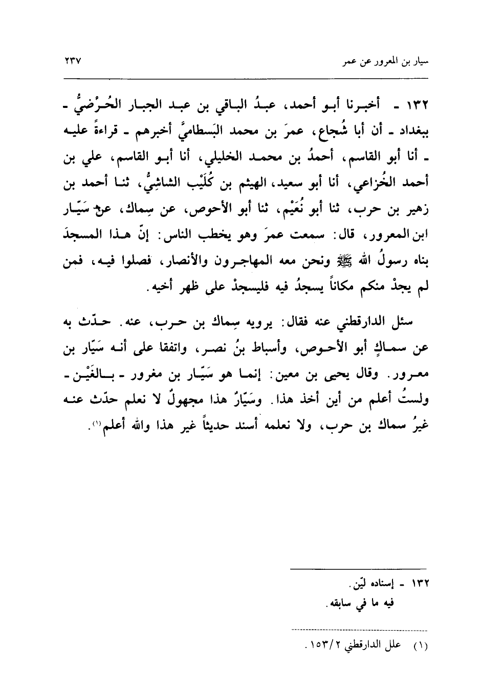 ١٣٢ - أَخْبَرَنَا أَبُو أَحْمَدَ عَبْدُ الْبَاقِي بْنُ عَبْدِ الْجَبَّارِ الْحُرْضِيُّ بِبَغْدَادَ أَنَّ أَبَا شُجَاعٍ عُمَرَ بْنَ مُحَمَّدٍ الْبِسْطَامِيَّ أَخْبَرَهُمْ - قِرَاءَةً عَلَيْهِ - أَنَا أَبُو الْقَاسِمِ أَحْمَدُ بْنُ مُحَمَّدٍ الْخَلِيلِيُّ، أَنَا أَبُو الْقَاسِمِ عَلِيُّ بْنُ أَحْمَدَ الْخُزَاعِيُّ، أَنَا أَبُو سَعِيدٍ الْهَيْثَمُ بْنُ كُلَيْبٍ الشَّاشِيُّ، ثَنَا أَحْمَدُ بْنُ زُهَيْرِ بْنِ حَرْبٍ، ثَنَا أَبُو نُعَيْمٍ، ثَنَا أَبُو الْأَحْوَصِ، عَنْ سِمَاكٍ، عَنْ سَيَّارِ بْنِ الْمَعْرُورِ قَالَ: سَمِعْتُ عُمَرَ وَهُوَ يَخْطُبُ النَّاسَ: «إِنَّ هَذَا الْمَسْجِدَ بَنَاهُ رَسُولُ اللهِ - صَلَّى اللهُ عَلَيْهِ وَسَلَّمَ - وَنَحْنُ مَعَهُ الْمُهَاجِرُونَ وَالْأَنْصَارُ، فَصَلُّوا فِيهِ فَمَنْ لَمْ يَجِدْ مِنْكُمْ مَكَانًا يَسْجُدُ فِيهِ فَلْيَسْجُدْ عَلَى ظَهْرِ أَخِيهِ».