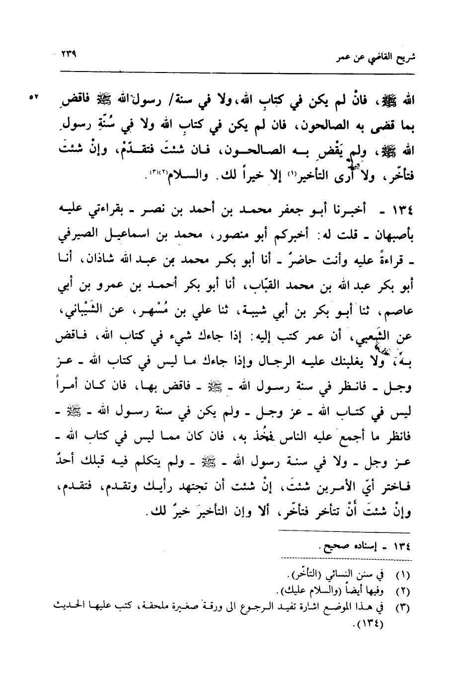 ١٣٤ - أَخْبَرَنَا أَبُو جَعْفَرٍ مُحَمَّدُ بْنُ أَحْمَدَ بْنِ نَصْرٍ - بِقِرَاءَتِي عَلَيْهِ بِأَصْبَهَانَ - قُلْتُ لَهُ: أَخْبَرَكُمْ أَبُو مَنْصُورٍ مُحَمَّدُ بْنُ إِسْمَاعِيلَ الصَّيْرَفِيُّ - قِرَاءَةً عَلَيْهِ وَأَنْتَ حَاضِرٌ - أَنَا أَبُو بَكْرٍ مُحَمَّدُ بْنُ عَبْدِ اللهِ شَاذَانُ، أَنَا أَبُو بَكْرٍ عَبْدُ اللهِ بْنُ مُحَمَّدٍ الْقَبَّابُ، أَنَا أَبُو بَكْرٍ أَحْمَدُ بْنُ عَمْرِو بْنِ أَبِي عَاصِمٍ، ثَنَا أَبُو بَكْرِ بْنُ أَبِي شَيْبَةَ، ثَنَا عَلِيُّ بْنُ مُسْهِرٍ، عَنِ الشَّيْبَانِيِّ، عَنِ الشَّعْبِيِّ «أَنَّ عُمَرَ كَتَبَ إِلَيْهِ: إِذَا جَاءَكَ شَيْءٌ فِي كِتَابِ اللهِ، فَاقْضِ بِهِ، وَلَا يَغْلِبَنَّكَ عَلَيْهِ الرِّجَالُ، وَإِذَا جَاءَكَ مَا لَيْسَ فِي كِتَابِ اللهِ - عَزَّ وَجَلَّ - فَانْظُرْ فِي سُنَّةِ رَسُولِ اللهِ - صَلَّى اللهُ عَلَيْهِ وَسَلَّمَ - فَاقْضِ بِهَا، فَإِنْ كَانَ أَمْرًا لَيْسَ فِي كِتَابِ اللهِ عَزَّ وَجَلَّ، وَلَمْ يَكُنْ فِي سُنَّةِ رَسُولِ اللهِ - صَلَّى اللهُ عَلَيْهِ وَسَلَّمَ - فَانْظُرْ مَا أَجْمَعَ عَلَيْهِ النَّاسُ فَخُذْ بِهِ، فَإِنْ كَانَ مِمَّا لَيْسَ فِي كِتَابِ اللهِ - عَزَّ وَجَلَّ - وَلَا فِي سُنَّةِ رَسُولِ اللهِ - صَلَّى اللهُ عَلَيْهِ وَسَلَّمَ - وَلَمْ يَتَكَلَّمْ فِيهِ قَبْلَكَ أَحَدٌ فَاخْتَرْ أَيَّ الْأَمْرَيْنِ شِئْتَ، إِنْ شِئْتَ أَنْ تَجْتَهِدَ رَأْيَكَ وَتَقَدَّمَ فَتَقَدَّمْ، وَإِنْ شِئْتَ أَنْ تَتَأَخَّرَ فَتَأَخَّرْ، أَلَا وَإِنَّ التَّأْخِيرَ خَيْرٌ لَكَ».
