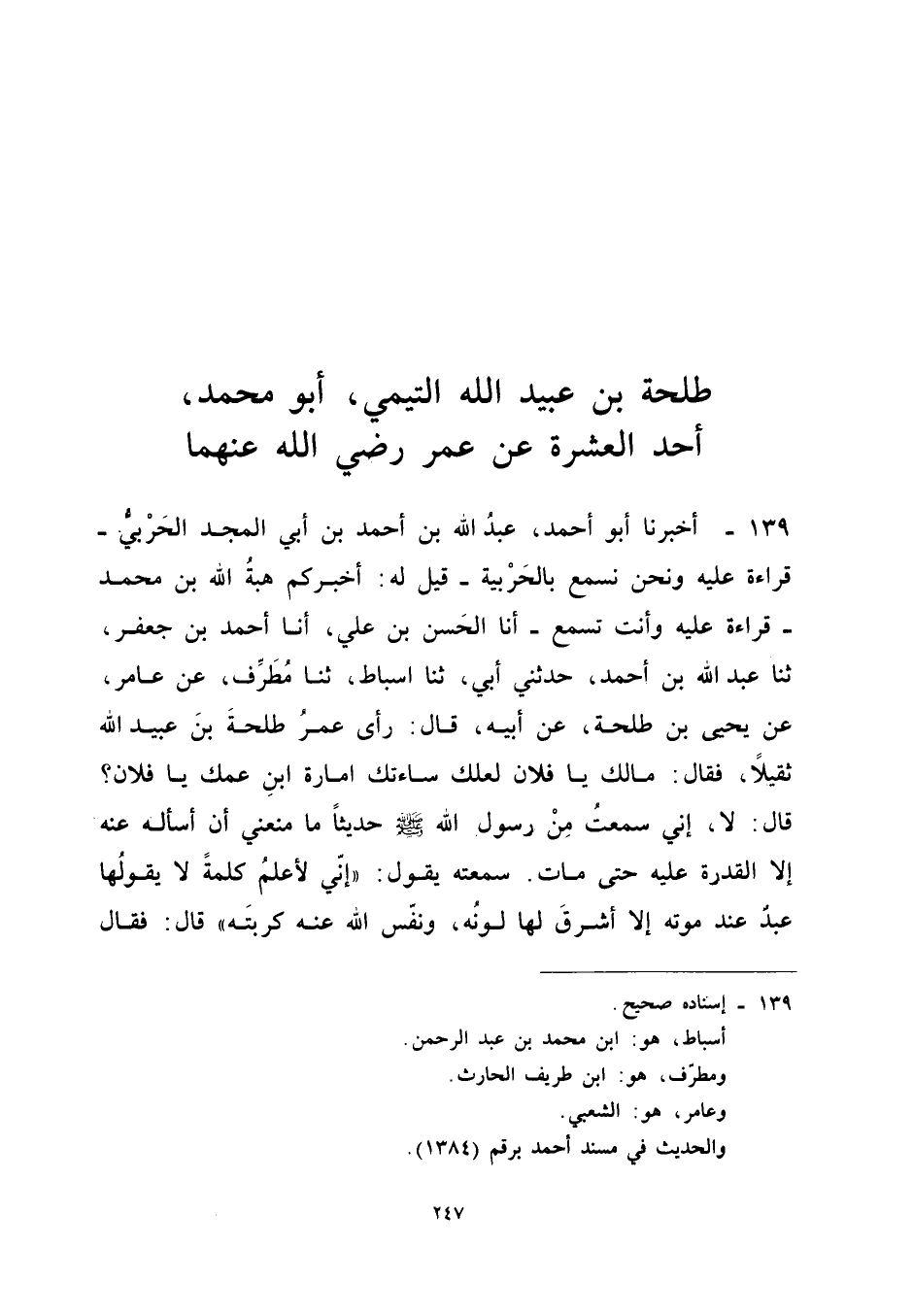 ١٣٩ - أَخْبَرَنَا أَبُو أَحْمَدَ عَبْدُ اللهِ بْنُ أَحْمَدَ بْنِ أَبِي الْمَجْدِ الْحَرْبِيُّ (¬١) - قِرَاءَةً عَلَيْهِ وَنَحْنُ نَسْمَعُ بِالْحَرْبِيَّةِ - قِيلَ لَهُ: أَخْبَرَكُمْ هِبَةُ اللهِ بْنُ مُحَمَّدٍ - قِرَاءَةً عَلَيْهِ وَأَنْتَ تَسْمَعُ - أَنَا الْحَسَنُ بْنُ عَلِيٍّ، أَنَا أَحْمَدُ بْنُ جَعْفَرٍ، ثَنَا عَبْدُ اللهِ بْنُ أَحْمَدَ، حَدَّثَنِي أَبِي، ثَنَا أَسْبَاطٌ، ثَنَا مُطَرِّفٌ، عَنْ عَامِرٍ، عَنْ يَحْيَى بْنِ طَلْحَةَ، عَنْ أَبِيهِ قَالَ: «رَأَى عُمَرُ طَلْحَةَ بْنَ عُبَيْدِ اللهِ ثَقِيلًا، فَقَالَ: مَا لَكَ يَا فُلَانُ لَعَلَّكَ سَاءَتْكَ إِمَارَةُ ابْنِ عَمِّكَ يَا فُلَانُ؟ قَالَ: لَا، إِنِّي سَمِعْتُ مِنْ رَسُولِ اللهِ - صَلَّى اللهُ عَلَيْهِ وَسَلَّمَ - حَدِيثًا مَا مَنَعَنِي أَنْ أَسْأَلَهُ عَنْهُ إِلَّا الْقُدْرَةُ عَلَيْهِ حَتَّى مَاتَ، سَمِعْتُهُ يَقُولُ: إِنِّي لَأَعْلَمُ كَلِمَةً لَا يَقُولُهَا عَبْدٌ عِنْدَ مَوْتِهِ إِلَّا أَشْرَقَ لَهَا لَوْنُهُ، وَنَفَّسَ اللهُ عَنْهُ كُرْبَتَهُ قَالَ: فَقَالَ