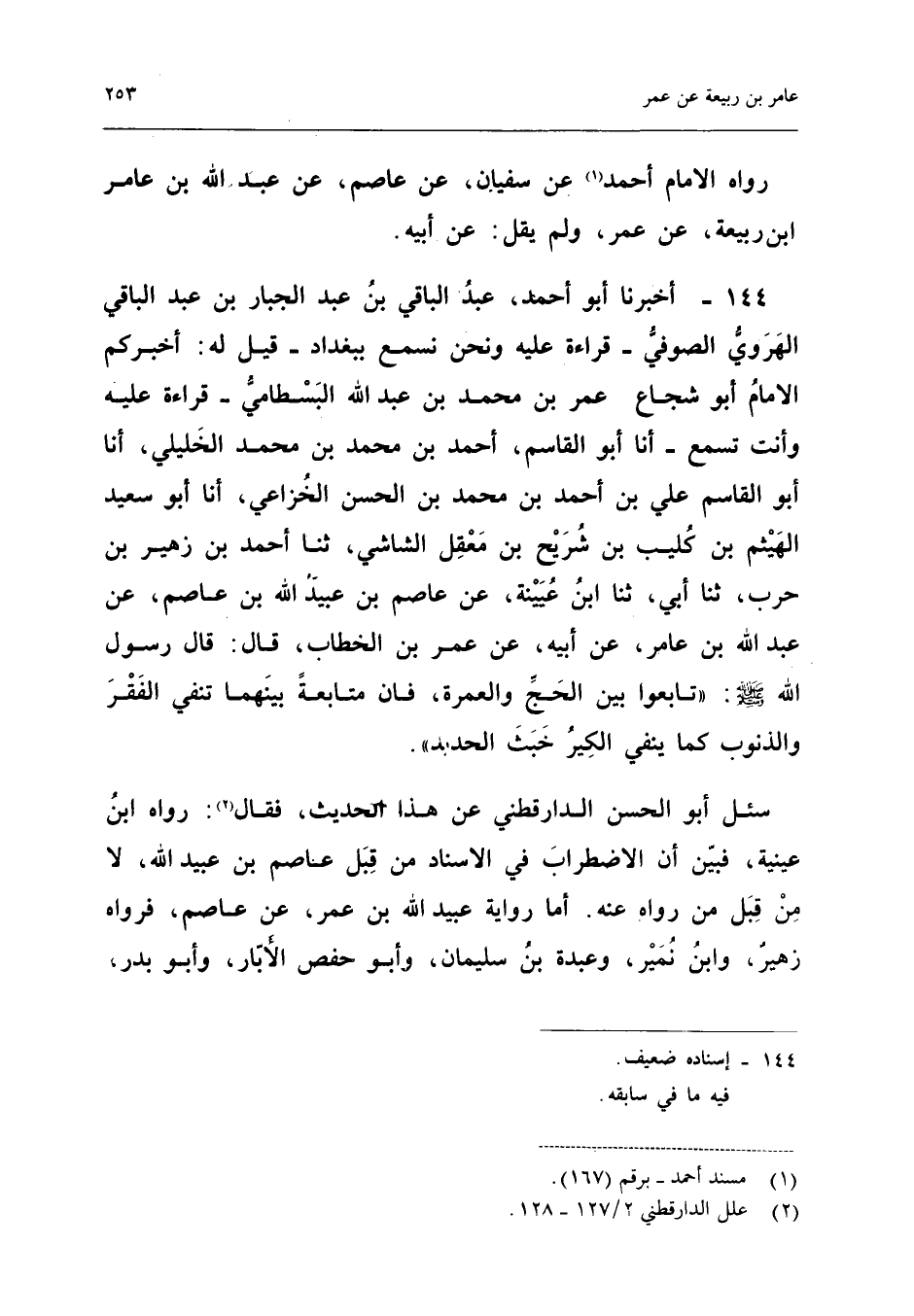 ١٤٤ - أَخْبَرَنَا أَبُو أَحْمَدَ عَبْدُ الْبَاقِي بْنُ عَبْدِ الْجَبَّارِ بْنِ عَبْدِ الْبَاقِي الْهَرَوِيُّ الصُّوفِيُّ - قِرَاءَةً عَلَيْهِ وَنَحْنُ نَسْمَعُ بِبَغْدَادَ - قِيلَ لَهُ: أَخْبَرَكُمُ الْإِمَامُ أَبُو شُجَاعٍ عُمَرُ بْنُ مُحَمَّدِ بْنِ عَبْدِ اللهِ الْبِسْطَامِيُّ - قِرَاءَةً عَلَيْهِ وَأَنْتَ تَسْمَعُ - أَنَا أَبُو الْقَاسِمِ أَحْمَدُ بْنُ مُحَمَّدِ بْنِ مُحَمَّدٍ الْخَلِيلِيُّ، أَنَا أَبُو الْقَاسِمِ عَلِيُّ بْنُ أَحْمَدَ بْنِ مُحَمَّدِ بْنِ الْحَسَنِ الْخُزَاعِيُّ، أَنَا أَبُو سَعِيدٍ الْهَيْثَمُ بْنُ كُلَيْبِ بْنِ شُرَيْحِ بْنِ مَعْقِلٍ الشَّاشِيُّ، ثَنَا أَحْمَدُ بْنُ زُهَيْرِ بْنِ حَرْبٍ، ثَنَا أَبِي، ثَنَا ابْنُ عُيَيْنَةَ، عَنْ عَاصِمِ بْنِ عُبَيْدِ اللهِ بْنِ عَاصِمٍ، عَنْ عَبْدِ اللهِ بْنِ عَامِرٍ، عَنْ أَبِيهِ، عَنْ عُمَرَ بْنِ الْخَطَّابِ قَالَ: قَالَ رَسُولُ اللهِ - صَلَّى اللهُ عَلَيْهِ وَسَلَّمَ -: «تَابِعُوا بَيْنَ الْحَجِّ وَالْعُمْرَةِ، فَإِنَّ مُتَابَعَةً بَيْنَهُمَا تَنْفِي الْفَقْرَ وَالذُّنُوبَ كَمَا يَنْفِي الْكِيرُ خَبَثَ الْحَدِيدِ».