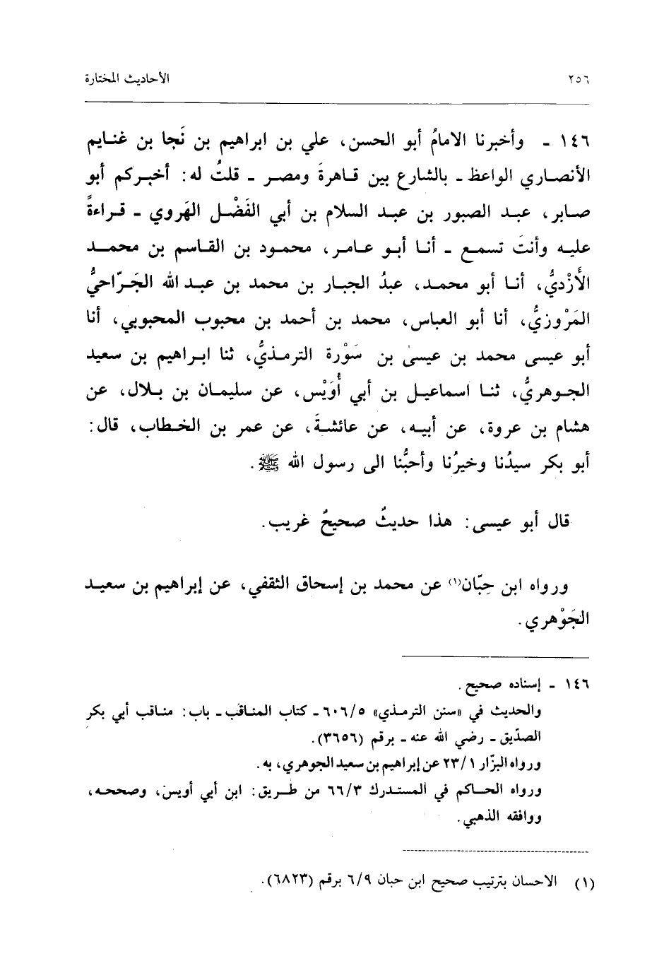 ١٤٦ - وَأَخْبَرَنَا الْإِمَامُ أَبُو الْحَسَنِ عَلِيُّ بْنُ إِبْرَاهِيمَ بْنِ نَجَا بْنِ غَنَايِمَ الْأَنْصَارِيُّ الْوَاعِظُ - بِالشَّارِعِ بَيْنَ قَاهِرَةَ وَمِصْرَ - قُلْتُ لَهُ: أَخْبَرَكُمْ أَبُو صَابِرٍ عَبْدُ الصَّبُورِ بْنُ عَبْدِ السَّلَامِ بْنِ أَبِي الْفَضْلِ الْهَرَوِيُّ - قِرَاءَةً عَلَيْهِ وَأَنْتَ تَسْمَعُ - أَنَا أَبُو عَامِرٍ مَحْمُودُ بْنُ الْقَاسِمِ بْنِ مُحَمَّدٍ الْأَزْدِيُّ، أَنَا أَبُو مُحَمَّدٍ عَبْدُ الْجَبَّارِ بْنُ مُحَمَّدِ بْنِ عَبْدِ اللهِ الْجَرَّاحِيُّ الْمَرْوَزِيُّ، أَنَا أَبُو الْعَبَّاسِ مُحَمَّدُ بْنُ أَحْمَدَ بْنِ مَحْبُوبٍ الْمَحْبُوبِيُّ، أَنَا أَبُو عِيسَى مُحَمَّدُ بْنُ عِيسَى بْنِ سَوْرَةَ التِّرْمِذِيُّ، ثَنَا إِبْرَاهِيمُ بْنُ سَعِيدٍ الْجَوْهَرِيُّ، ثَنَا إِسْمَاعِيلُ بْنُ أَبِي أُوَيْسٍ، عَنْ سُلَيْمَانَ بْنِ بِلَالٍ، عَنْ هِشَامِ بْنِ عُرْوَةَ، عَنْ أَبِيهِ، عَنْ عَائِشَةَ، عَنْ عُمَرَ بْنِ الْخَطَّابِ قَالَ: «أَبُو بَكْرٍ سَيِّدُنَا وَخَيْرُنَا وَأَحَبُّنَا إِلَى رَسُولِ اللهِ - صَلَّى اللهُ عَلَيْهِ وَسَلَّمَ» -.