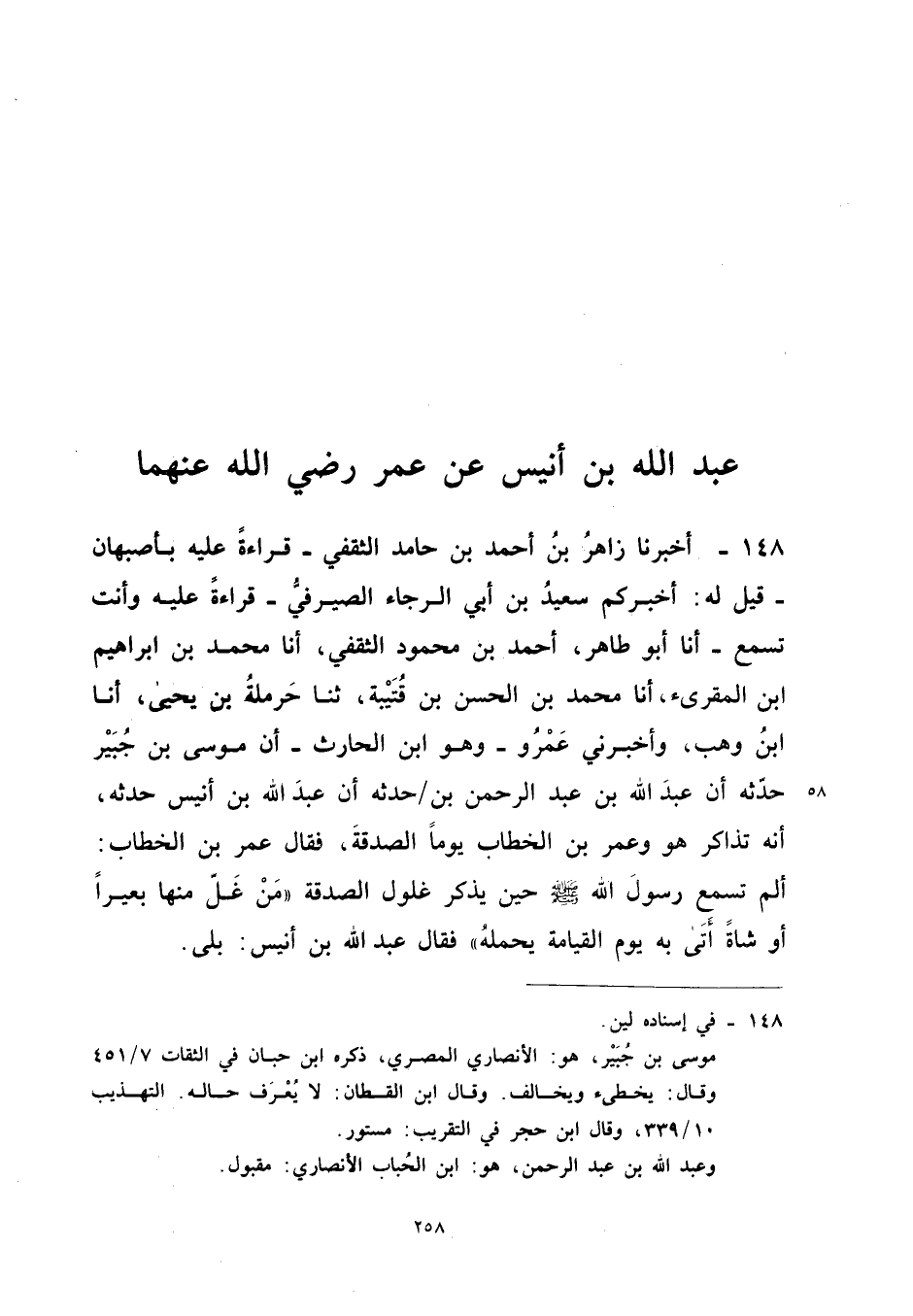 ١٤٨ - أَخْبَرَنَا زَاهِرُ بْنُ أَحْمَدَ بْنِ حَامِدٍ الثَّقَفِيُّ - قِرَاءَةً عَلَيْهِ بِأَصْبَهَانَ - قِيلَ لَهُ: أَخْبَرَكُمْ سَعِيدُ بْنُ أَبِي الرَّجَاءِ الصَّيْرَفِيُّ - قِرَاءَةً عَلَيْهِ وَأَنْتَ تَسْمَعُ - أَنَا أَبُو طَاهِرٍ أَحْمَدُ بْنُ مَحْمُودٍ الثَّقَفِيُّ، أَنَا مُحَمَّدُ بْنُ إِبْرَاهِيمَ بْنِ الْمُقْرِئِ، أَنَا مُحَمَّدُ بْنُ الْحَسَنِ بْنِ قُتَيْبَةَ، ثَنَا حَرْمَلَةُ بْنُ يَحْيَى، أَنَا ابْنُ وَهْبٍ، وَأَخْبَرَنِي عَمْرٌو - وَهُوَ: ابْنُ الْحَارِثِ - أَنَّ مُوسَى بْنَ جُبَيْرٍ حَدَّثَهُ أَنَّ عَبْدَ اللهِ بْنَ عَبْدِ الرَّحْمَنِ بْنِ حَدَّثَهُ أَنَّ عَبْدَ اللهِ بْنَ أُنَيْسٍ حَدَّثَهُ «أَنَّهُ تَذَاكَرَ هُوَ وَعُمَرُ بْنُ الْخَطَّابِ يَوْمًا الصَّدَقَةَ، فَقَالَ عُمَرُ بْنُ الْخَطَّابِ: أَلَمْ تَسْمَعْ رَسُولَ اللهِ - صَلَّى اللهُ عَلَيْهِ وَسَلَّمَ - حِينَ يَذْكُرُ غُلُولَ الصَّدَقَةِ مَنْ غَلَّ مِنْهَا بَعِيرًا أَوْ شَاةً أَتَى بِهِ يَوْمَ الْقِيَامَةِ يَحْمِلُهُ فَقَالَ عَبْدُ اللهِ بْنُ أُنَيْسٍ: بَلَى».