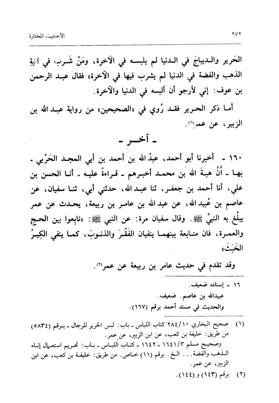 ١٦٠ - أَخْبَرَنَا أَبُو أَحْمَدَ عَبْدُ اللهِ بْنُ أَحْمَدَ بْنِ أَبِي الْمَجْدِ الْحَرْبِيُّ (¬١) بِهَا أَنَّ هِبَةَ اللهِ بْنَ مُحَمَّدٍ أَخْبَرَهُمْ - قِرَاءَةً عَلَيْهِ - أَنَا الْحَسَنُ بْنُ عَلِيٍّ، أَنَا أَحْمَدُ بْنُ جَعْفَرٍ، ثَنَا عَبْدُ اللهِ، حَدَّثَنِي أَبِي، ثَنَا سُفْيَانُ، عَنْ عَاصِمِ بْنِ عُبَيْدِ اللهِ، عَنْ عَبْدِ اللهِ بْنِ عَامِرِ بْنِ رَبِيعَةَ، يُحَدِّثُ عَنْ عُمَرَ يَبْلُغُ بِهِ النَّبِيَّ - صَلَّى اللهُ عَلَيْهِ وَسَلَّمَ - وَقَالَ سُفْيَانُ مَرَّةً: عَنِ النَّبِيِّ - صَلَّى اللهُ عَلَيْهِ وَسَلَّمَ - «تَابِعُوا بَيْنَ الْحَجِّ وَالْعُمْرَةِ، فَإِنَّ مُتَابَعَةَ بَيْنِهِمَا يَنْفِيَانِ الْفَقْرَ وَالذُّنُوبَ، كَمَا يَنْفِي الْكِيرُ الْخَبَثَ».