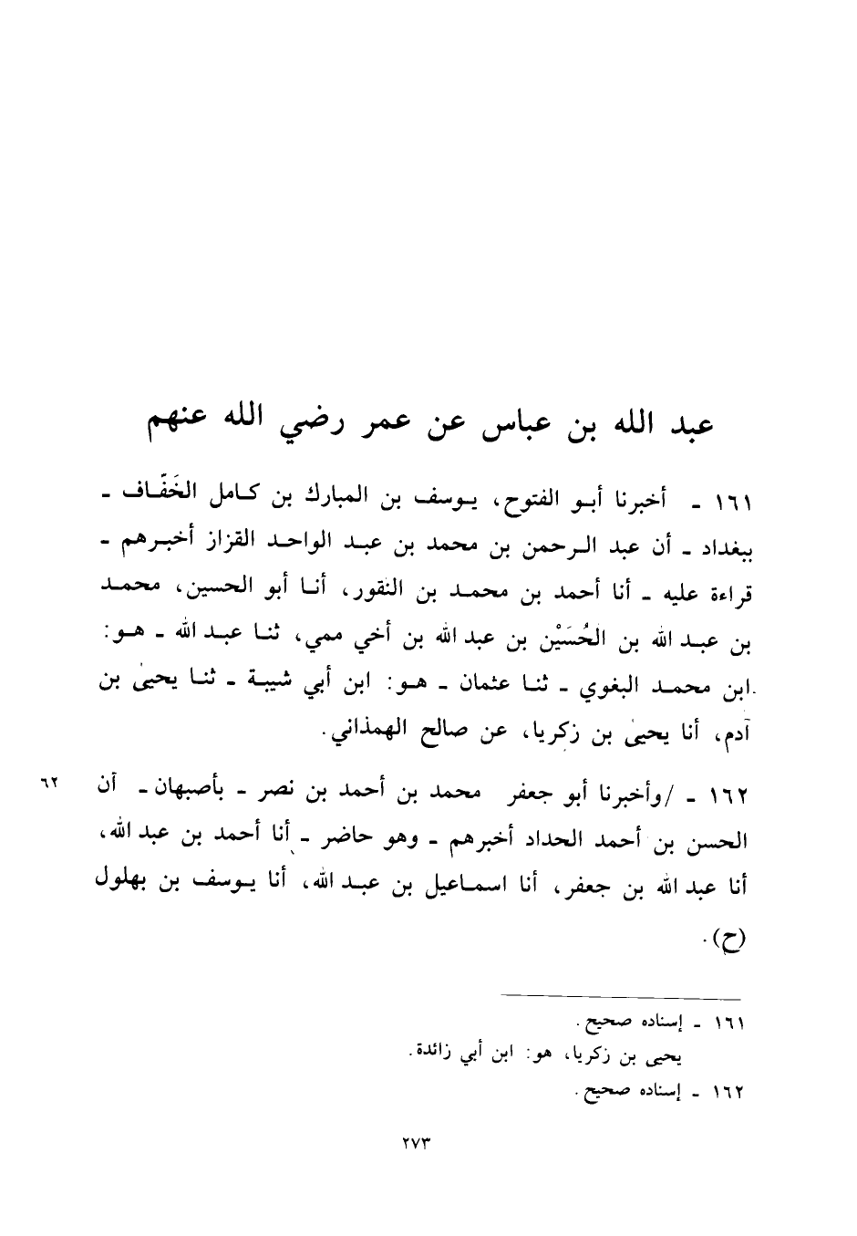 ١٦١ - أَخْبَرَنَا أَبُو الْفُتُوحِ يُوسُفُ بْنُ الْمُبَارَكِ بْنِ كَامِلٍ الْخَفَّافُّ - بِبَغْدَادَ - أَنَّ عَبْدَ الرَّحْمَنِ بْنَ مُحَمَّدِ بْنِ عَبْدِ الْوَاحِدِ الْقَزَّازَ أَخْبَرَهُمْ - قِرَاءَةً عَلَيْهِ - أَنَا أَحْمَدُ بْنُ مُحَمَّدِ بْنِ النُّقُورِ، أَنَا أَبُو الْحُسَيْنِ مُحَمَّدُ بْنُ عَبْدِ اللهِ بْنِ الْحُسَيْنِ بْنِ عَبْدِ اللهِ بْنِ أَخِي مِمِّيٍّ (¬١)، ثَنَا عَبْدُ اللهِ - هُوَ: ابْنُ مُحَمَّدٍ الْبَغَوِيُّ - ثَنَا عُثْمَانُ - هُوَ: ابْنُ أَبِي شَيْبَةَ - ثَنَا يَحْيَى بْنُ آدَمَ، أَنَا يَحْيَى بْنُ زَكَرِيَّا، عَنْ صَالِحٍ الْهَمَذَانِيِّ.