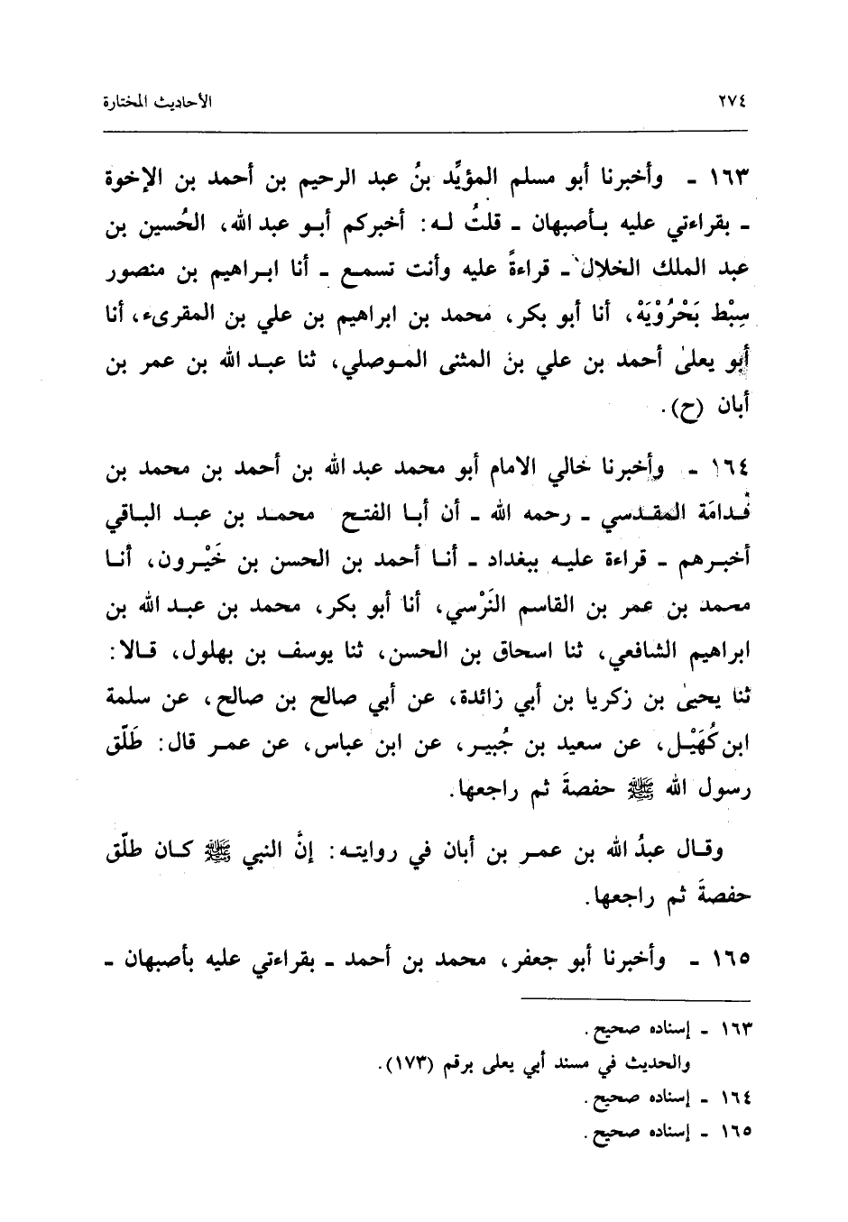 ١٦٤ - وَأَخْبَرَنَا خَالِي الْإِمَامُ أَبُو مُحَمَّدٍ عَبْدُ اللهِ بْنُ أَحْمَدَ بْنِ مُحَمَّدِ بْنِ قُدَامَةَ الْمَقْدِسِيُّ - رَحِمَهُ اللهُ - أَنَّ أَبَا الْفَتْحِ مُحَمَّدَ بْنَ عَبْدِ الْبَاقِي أَخْبَرَهُمْ - قِرَاءَةً عَلَيْهِ بِبَغْدَادَ - أَنَا أَحْمَدُ بْنُ الْحَسَنِ بْنِ خَيْرُونَ، أَنَا مُحَمَّدُ بْنُ عُمَرَ بْنِ الْقَاسِمِ النَّرْسِيُّ، أَنَا أَبُو بَكْرٍ مُحَمَّدُ بْنُ عَبْدِ اللهِ بْنِ إِبْرَاهِيمَ الشَّافِعِيُّ، ثَنَا إِسْحَاقُ بْنُ الْحَسَنِ، ثَنَا يُوسُفُ بْنُ بُهْلُولٍ، قَالَا: ثَنَا يَحْيَى بْنُ زَكَرِيَّا بْنِ أَبِي زَائِدَةَ، عَنْ أَبِي صَالِحِ بْنِ صَالِحٍ، عَنْ سَلَمَةَ بْنِ كُهَيْلٍ، عَنْ سَعِيدِ بْنِ جُبَيْرٍ، عَنِ ابْنِ عَبَّاسٍ، عَنْ عُمَرَ قَالَ: «طَلَّقَ رَسُولُ اللهِ - صَلَّى اللهُ عَلَيْهِ وَسَلَّمَ - حَفْصَةَ، ثُمَّ رَاجَعَهَا.