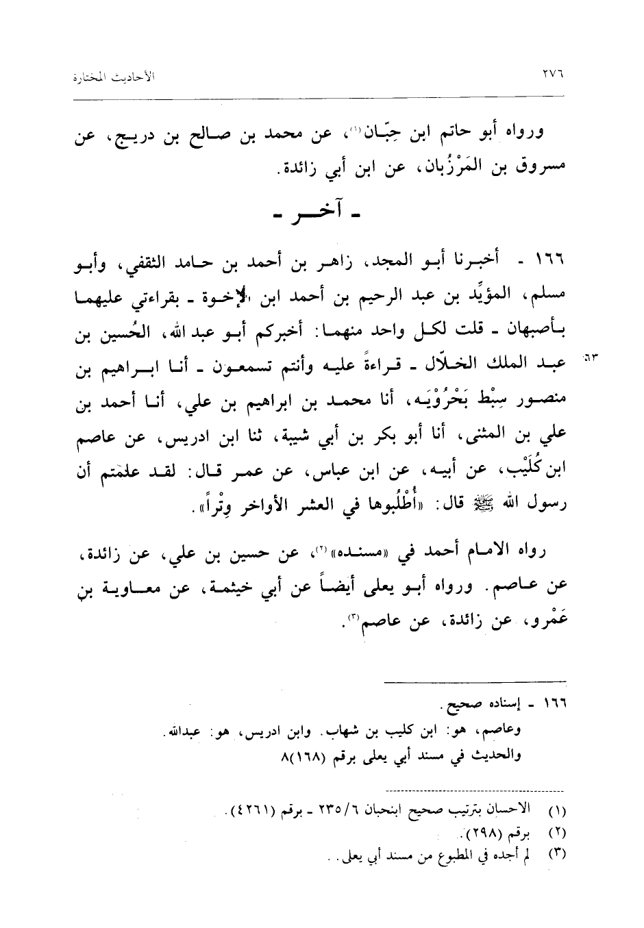 ١٦٦ - أَخْبَرَنَا أَبُو الْمَجْدِ زَاهِرُ بْنُ أَحْمَدَ بْنِ حَامِدٍ الثَّقَفِيُّ، وَأَبُو مُسْلِمٍ الْمُؤَيَّدُ بْنُ عَبْدِ الرَّحِيمِ بْنِ أَحْمَدَ بْنِ الْإِخْوَةِ - بِقِرَاءَتِي عَلَيْهِ مَا بِأَصْبَهَانَ - قُلْتُ: لِكُلِّ وَاحِدٍ مِنْهُمَا: أَخْبَرَكُمْ أَبُو عَبْدِ اللهِ الْحُسَيْنُ بْنُ عَبْدِ الْمَلِكِ الْخَلَّالُ - قِرَاءَةً عَلَيْهِ وَأَنْتُمْ تَسْمَعُونَ - أَنَا إِبْرَاهِيمُ بْنُ مَنْصُورٍ سِبْطُ بَحْرَوَيْهِ، أَنَا مُحَمَّدُ بْنُ إِبْرَاهِيمَ بْنِ عَلِيٍّ، أَنَا أَحْمَدُ بْنُ عَلِيِّ بْنِ الْمُثَنَّى، أَنَا أَبُو بَكْرِ بْنُ أَبِي شَيْبَةَ، ثَنَا ابْنُ إِدْرِيسَ، عَنْ عَاصِمِ بْنِ كُلَيْبٍ، عَنْ أَبِيهِ، عَنِ ابْنِ عَبَّاسٍ، عَنْ عُمَرَ قَالَ: «لَقَدْ عَلِمْتُمْ أَنَّ رَسُولَ اللهِ - صَلَّى اللهُ عَلَيْهِ وَسَلَّمَ - قَالَ: اطْلُبُوهَا فِي الْعَشْرِ الْأَوَاخِرِ وِتْرًا».