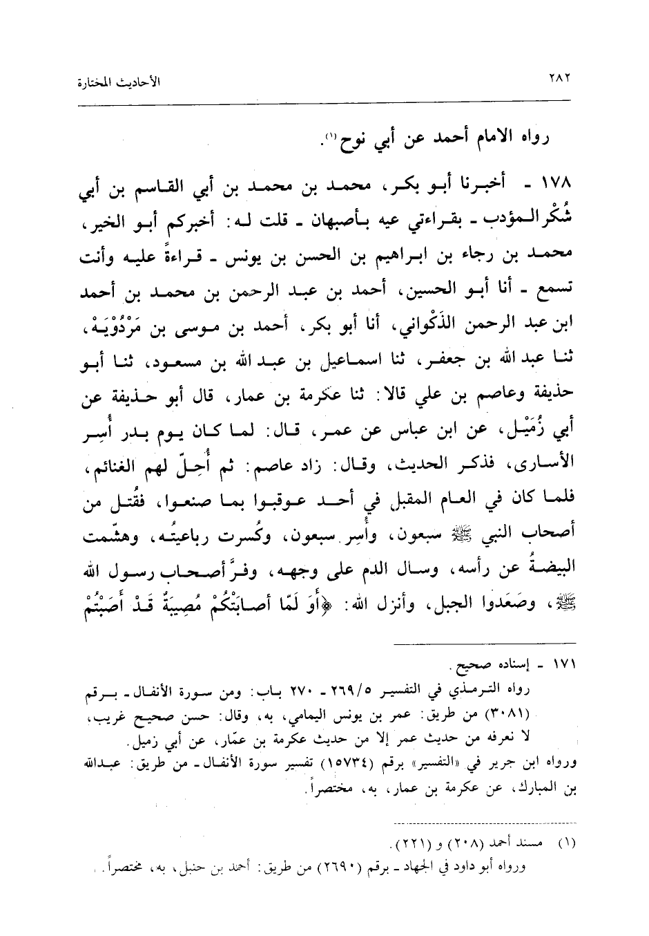 ١٧١ - أَخْبَرَنَا أَبُو بَكْرٍ مُحَمَّدُ بْنُ مُحَمَّدِ بْنِ أَبِي الْقَاسِمِ بْنِ أَبِي شُكْرٍ الْمُؤَدِّبُ - بِقِرَاءَتِي عَلَيْهِ بِأَصْبَهَانَ - قُلْتُ لَهُ: أَخْبَرَكُمْ أَبُو الْخَيْرِ مُحَمَّدُ بْنُ رَجَاءِ بْنِ إِبْرَاهِيمَ بْنِ الْحَسَنِ بْنِ يُونُسَ - قِرَاءَةً عَلَيْهِ وَأَنْتَ تَسْمَعُ - أَنَا أَبُو الْحُسَيْنِ أَحْمَدُ بْنُ عَبْدِ الرَّحْمَنِ بْنِ مُحَمَّدِ بْنِ أَحْمَدَ بْنِ عَبْدِ الرَّحْمَنِ الذَّكْوَانِيُّ، أَنَا أَبُو بَكْرٍ أَحْمَدُ بْنُ مُوسَى بْنِ مَرْدُوَيْهِ، ثَنَا عَبْدُ اللهِ بْنُ جَعْفَرٍ، ثَنَا إِسْمَاعِيلُ بْنُ عَبْدِ اللهِ بْنِ مَسْعُودٍ، ثَنَا أَبُو حُذَيْفَةَ وَعَاصِمُ بْنُ عَلِيٍّ قَالَا: ثَنَا عِكْرِمَةُ بْنُ عَمَّارٍ، قَالَ أَبُو حُذَيْفَةَ عَنْ أَبِي زُمَيْلٍ، عَنِ ابْنِ عَبَّاسٍ عَنْ عُمَرَ، قَالَ: «لَمَّا كَانَ يَوْمُ بَدْرٍ أُسِرَ الْأُسَارَى، فَذَكَرَ الْحَدِيثَ وَقَالَ: زَادَ عَاصِمٌ: ثُمَّ أُحِلَّ لَهُمُ الْغَنَائِمُ، فَلَمَّا كَانَ فِي الْعَامِ الْمُقْبِلِ فِي أُحُدٍ عُوقِبُوا بِمَا صَنَعُوا، فَقُتِلَ مِنْ أَصْحَابِ النَّبِيِّ - صَلَّى اللهُ عَلَيْهِ وَسَلَّمَ - سَبْعُونَ وَأُسِرَ سَبْعُونَ، وَكُسِرَتْ رَبَاعِيَّتُهُ، وَهُشِّمَتِ الْبَيْضَةُ عَنْ رَأْسِهِ، وَسَالَ الدَّمُ عَلَى وَجْهِهِ، وَفَرَّ أَصْحَابُ رَسُولِ اللهِ - صَلَّى اللهُ عَلَيْهِ وَسَلَّمَ - وَصَعِدُوا الْجَبَلَ وَأَنْزَلَ اللهُ: {أَوَلَمَّا أَصَابَتْكُمْ مُصِيبَةٌ قَدْ أَصَبْتُمْ مِثْلَيْهَا}