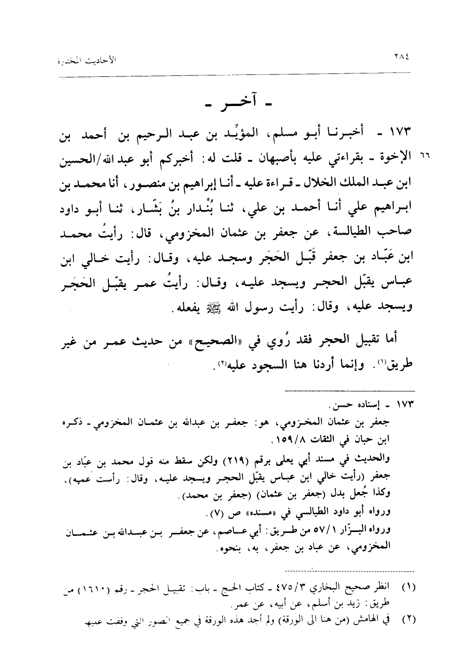 ١٧٣ - أَخْبَرَنَا أَبُو مُسْلِمٍ الْمُؤَيَّدُ بْنُ عَبْدِ الرَّحِيمِ بْنِ أَحْمَدَ بْنِ الْإِخْوَةِ - بِقِرَاءَتِي عَلَيْهِ بِأَصْبَهَانَ - قُلْتُ لَهُ: أَخْبَرَكُمْ أَبُو عَبْدِ اللهِ الْحُسَيْنُ بْنُ عَبْدِ الْمَلِكِ الْخَلَّالُ - قِرَاءَةً عَلَيْهِ - أَنَا إِبْرَاهِيمُ بْنُ مَنْصُورٍ، أَنَا مُحَمَّدُ بْنُ إِبْرَاهِيمَ عَلِيٍّ، أَنَا أَحْمَدُ بْنُ عَلِيٍّ، ثَنَا بُنْدَارُ بْنُ بَشَّارٍ، ثَنَا أَبُو دَاوُدَ صَاحِبُ الطَّيَالِسَةِ، عَنْ جَعْفَرِ بْنِ عُثْمَانَ الْمَخْزُومِيِّ، قَالَ: «رَأَيْتُ مُحَمَّدَ بْنَ عَبَّادِ بْنِ جَعْفَرٍ قَبَّلَ الْحَجَرَ وَسَجَدَ عَلَيْهِ وَقَالَ: رَأَيْتُ خَالِيَ ابْنَ عَبَّاسٍ يُقَبِّلُ الْحَجَرَ وَيَسْجُدُ عَلَيْهِ، وَقَالَ: رَأَيْتُ عُمَرَ يُقَبِّلُ الْحَجَرَ وَيَسْجُدُ عَلَيْهِ، وَقَالَ: رَأَيْتُ رَسُولَ اللهِ - صَلَّى اللهُ عَلَيْهِ وَسَلَّمَ - يَفْعَلُهُ».