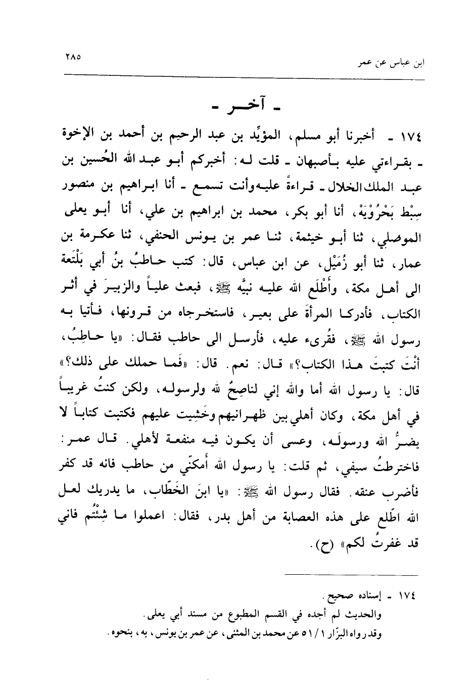 ١٧٤ - أَخْبَرَنَا أَبُو مُسْلِمٍ الْمُؤَيَّدُ بْنُ عَبْدِ الرَّحِيمِ بْنِ أَحْمَدَ بْنِ الْإِخْوَةِ - بِقِرَاءَتِي عَلَيْهِ بِأَصْبَهَانَ - قُلْتُ لَهُ: أَخْبَرَكُمْ أَبُو عَبْدِ اللهِ الْحُسَيْنُ بْنُ عَبْدِ الْمَلِكِ الْخَلَّالُ - قِرَاءَةً عَلَيْهِ وَأَنْتَ تَسْمَعُ - أَنَا إِبْرَاهِيمُ بْنُ مَنْصُورٍ سِبْطُ بَحْرَوَيْهِ، أَنَا أَبُو بَكْرٍ، مُحَمَّدُ بْنُ إِبْرَاهِيمَ بْنِ عَلِيٍّ، أَنَا أَبُو يَعْلَى الْمَوْصِلِيُّ، ثَنَا أَبُو خَيْثَمَةَ، ثَنَا عُمَرُ بْنُ يُونُسَ الْحَنَفِيُّ، ثَنَا عِكْرِمَةُ بْنُ عَمَّارٍ، ثَنَا أَبُو زُمَيْلٍ، عَنِ ابْنِ عَبَّاسٍ قَالَ: «كَتَبَ حَاطِبُ بْنُ أَبِي بَلْتَعَةَ إِلَى أَهْلِ مَكَّةَ، وَأَطْلَعَ اللهُ عَلَيْهِ نَبِيَّهُ - صَلَّى اللهُ عَلَيْهِ وَسَلَّمَ - فَبَعَثَ عَلِيًّا، وَالزُّبَيْرَ فِي أَثَرِ الْكِتَابِ، فَأَدْرَكَا الْمَرْأَةَ عَلَى بَعِيرٍ، فَاسْتَخْرَجَاهُ مِنْ قُرُونِهَا، فَأَتَيَا بِهِ رَسُولَ اللهِ - صَلَّى اللهُ عَلَيْهِ وَسَلَّمَ - فَقُرِئَ عَلَيْهِ، فَأَرْسَلَ إِلَى حَاطِبٍ فَقَالَ: يَا حَاطِبُ أَنْتَ كَتَبْتَ هَذَا الْكِتَابَ؟ قَالَ: نَعَمْ. قَالَ: فَمَا حَمَلَكَ عَلَى ذَلِكَ؟ قَالَ: يَا رَسُولَ اللهِ أَمَا وَاللهِ إِنِّي لَنَاصِحٌ لِلهِ وَلِرَسُولِهِ، وَلَكِنْ كُنْتُ غَرِيبًا فِي أَهْلِ مَكَّةَ، وَكَانَ أَهْلِي بَيْنَ ظَهْرَانَيْهِمْ وَخَشِيتُ عَلَيْهِمْ فَكَتَبْتُ كِتَابًا لَا يَضُرُّ اللهَ وَرَسُولَهُ، وَعَسَى أَنْ يَكُونَ فِيهِ مَنْفَعَةٌ لِأَهْلِي. قَالَ عُمَرُ: فَاخْتَرَطْتُ سَيْفِي، ثُمَّ قُلْتُ: يَا رَسُولَ اللهِ أَمْكِنِّي مِنْ حَاطِبٍ فَإِنَّهُ قَدْ كَفَرَ فَأَضْرِبَ عُنُقَهُ، فَقَالَ رَسُولُ اللهِ - صَلَّى اللهُ عَلَيْهِ وَسَلَّمَ -: يَا ابْنَ الْخَطَّابِ، مَا يُدْرِيكَ لَعَلَّ اللهَ اطَّلَعَ عَلَى هَذِهِ الْعِصَابَةِ مِنْ أَهْلِ بَدْرٍ، فَقَالَ: اعْمَلُوا مَا شِئْتُمْ، فَإِنِّي قَدْ غَفَرْتُ لَكُمْ» (ح).