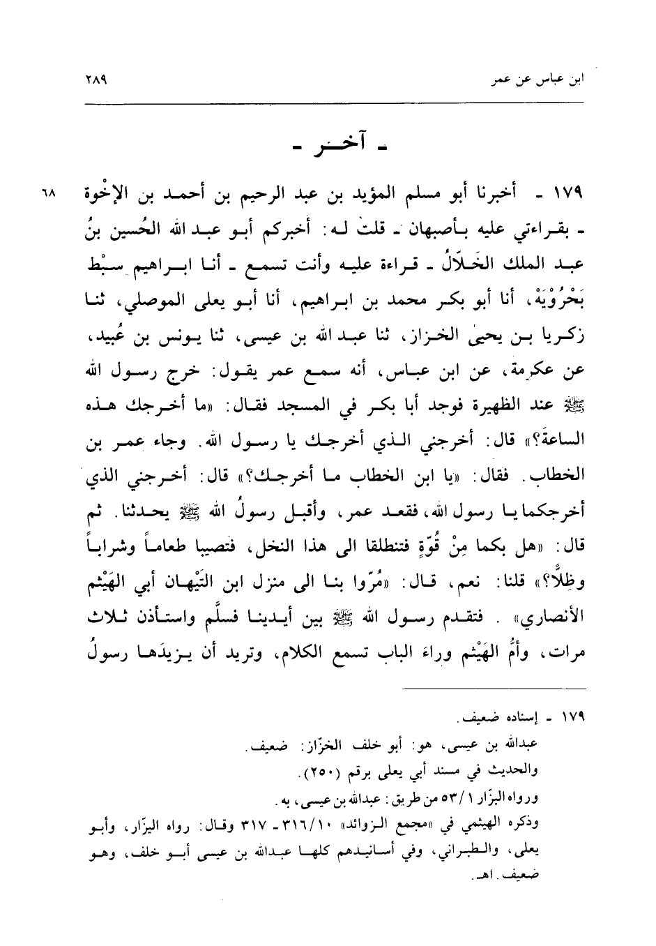 ١٧٩ - أَخْبَرَنَا أَبُو مُسْلِمٍ الْمُؤَيَّدُ بْنُ عَبْدِ الرَّحِيمِ بْنِ أَحْمَدَ بْنِ الْإِخْوَةِ - بِقِرَاءَتِي عَلَيْهِ بِأَصْبَهَانَ - قُلْتُ لَهُ: أَخْبَرَكُمْ أَبُو عَبْدِ اللهِ الْحُسَيْنُ بْنُ عَبْدِ الْمَلِكِ الْخَلَّالُ - قِرَاءَةً عَلَيْهِ وَأَنْتَ تَسْمَعُ - أَنَا إِبْرَاهِيمُ سِبْطُ بَحْرَوَيْهِ، أَنَا أَبُو بَكْرٍ مُحَمَّدُ بْنُ إِبْرَاهِيمَ، أَنَا أَبُو يَعْلَى الْمَوْصِلِيُّ، ثَنَا زَكَرِيَّا بْنُ يَحْيَى الْخَزَّازُ، ثَنَا عَبْدُ اللهِ بْنُ عِيسَى، ثَنَا يُونُسُ بْنُ عُبَيْدٍ، عَنْ عِكْرِمَةَ، عَنِ ابْنِ عَبَّاسٍ أَنَّهُ سَمِعَ عُمَرَ يَقُولُ «خَرَجَ رَسُولُ اللهِ - صَلَّى اللهُ عَلَيْهِ وَسَلَّمَ - عِنْدَ الظَّهِيرَةِ فَوَجَدَ أَبَا بَكْرٍ فِي الْمَسْجِدِ، فَقَالَ: مَا أَخْرَجَكَ هَذِهِ السَّاعَةَ؟ قَالَ: أَخْرَجَنِي الَّذِي أَخْرَجَكَ يَا رَسُولَ اللهِ وَجَاءَ عُمَرُ بْنُ الْخَطَّابِ، فَقَالَ: يَا ابْنَ الْخَطَّابِ مَا أَخْرَجَكَ؟ قَالَ: أَخْرَجَنِي الَّذِي أَخْرَجَكُمَا يَا رَسُولَ اللهِ، فَقَعَدَ عُمَرُ وَأَقْبَلَ رَسُولُ اللهِ - صَلَّى اللهُ عَلَيْهِ وَسَلَّمَ - يُحَدِّثُنَا ثُمَّ قَالَ: هَلْ بِكُمَا مِنْ قُوَّةٍ فَتَنْطَلِقَا إِلَى هَذَا النَّخْلِ فَتُصِيبَا طَعَامًا وَشَرَابًا وَظِلًّا؟ قُلْنَا: نَعَمْ، قَالَ: مُرُّوا بِنَا إِلَى مَنْزِلِ ابْنِ التَّيِّهَانِ أَبِي الْهَيْثَمِ الْأَنْصَارِيِّ فَتَقَدَّمَ رَسُولُ اللهِ - صَلَّى اللهُ عَلَيْهِ وَسَلَّمَ - بَيْنَ أَيْدِينَا فَسَلَّمَ، وَاسْتَأْذَنَ ثَلَاثَ مَرَّاتٍ وَأُمُّ الْهَيْثَمِ وَرَاءَ الْبَابِ تَسْمَعُ الْكَلَامَ وَتُرِيدُ أَنْ يَزِيدَهَا رَسُولُ