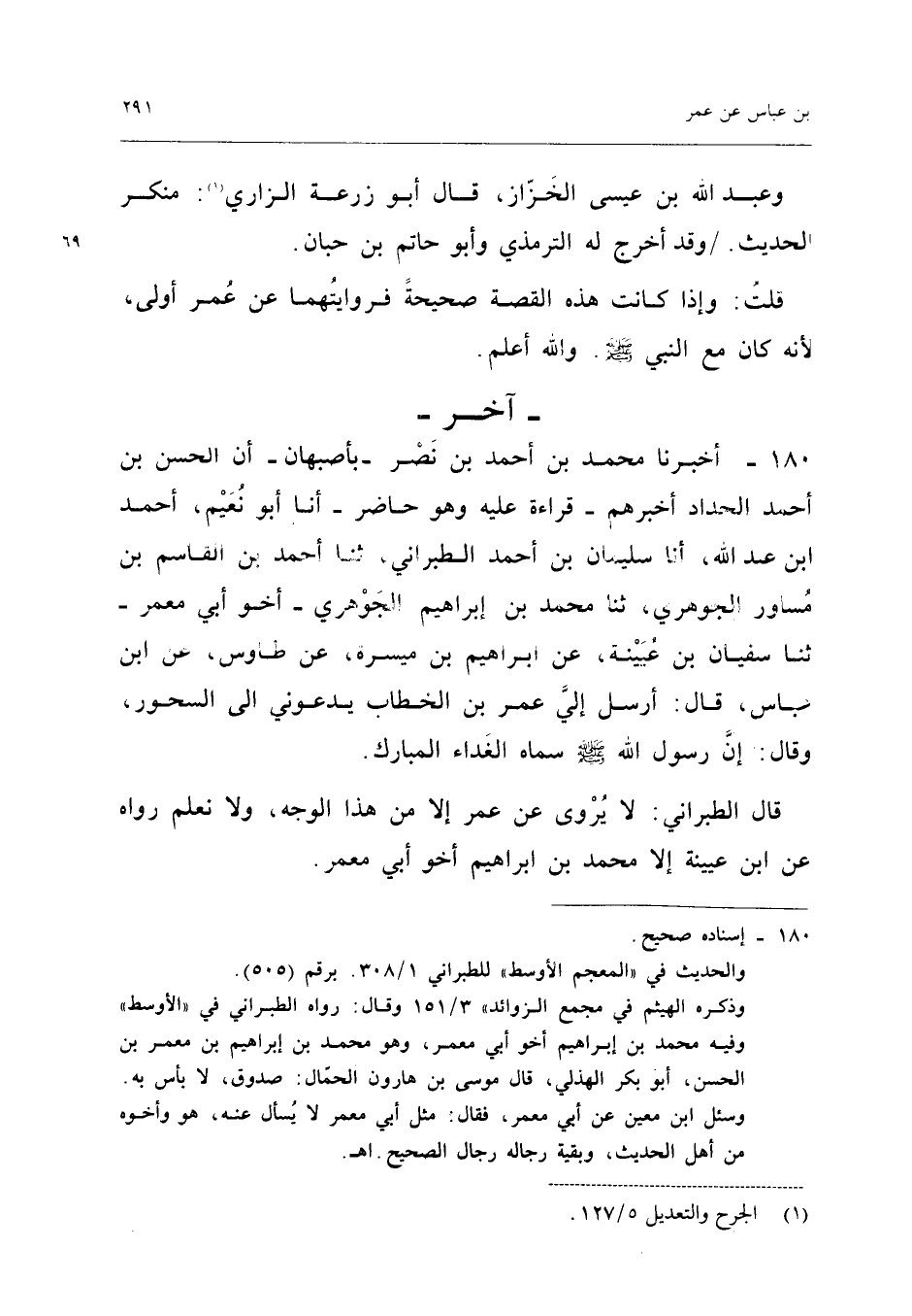 قَالَ الطَّبَرَانِيُّ: لَا يُرْوَى عَنْ عُمَرَ إِلَّا مِنْ هَذَا الْوَجْهِ، وَلَا نَعْلَمُ رَوَاهُ عَنِ ابْنِ عُيَيْنَةَ إِلَّا مُحَمَّدُ بْنُ إِبْرَاهِيمَ أَخُو أَبِي مَعْمَرٍ.