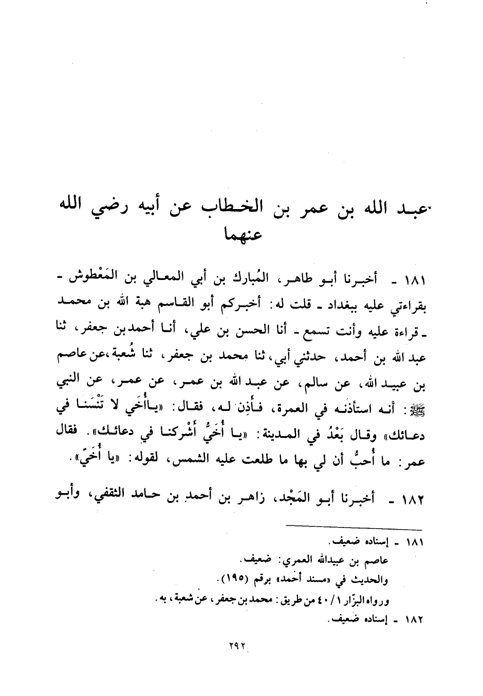 ١٨١ - أَخْبَرَنَا أَبُو طَاهِرٍ الْمُبَارَكُ بْنُ أَبِي الْمَعَالِي بْنِ الْمَعْطُوشِ - بِقِرَاءَتِي عَلَيْهِ بِبَغْدَادَ - قُلْتُ لَهُ: أَخْبَرَكُمْ أَبُو الْقَاسِمِ هِبَةُ اللهِ بْنُ مُحَمَّدٍ - قِرَاءَةً عَلَيْهِ وَأَنْتَ تَسْمَعُ - أَنَا الْحَسَنُ بْنُ عَلِيٍّ، أَنَا أَحْمَدُ بْنُ جَعْفَرٍ، ثَنَا عَبْدُ اللهِ بْنُ أَحْمَدَ، حَدَّثَنِي أَبِي، ثَنَا مُحَمَّدُ بْنُ جَعْفَرٍ، ثَنَا شُعْبَةُ، عَنْ عَاصِمِ بْنِ عُبَيْدِ اللهِ، عَنْ سَالِمٍ، عَنْ عَبْدِ اللهِ بْنِ عُمَرَ، عَنْ عُمَرَ، عَنِ النَّبِيِّ - صَلَّى اللهُ عَلَيْهِ وَسَلَّمَ - «أَنَّهُ اسْتَأْذَنَهُ فِي الْعُمْرَةِ، فَأَذِنَ لَهُ، فَقَالَ: يَا أُخَيَّ لَا تَنْسَنَا فِي دُعَائِكَ، وَقَالَ بَعْدُ فِي الْمَدِينَةِ: يَا أُخَيَّ أَشْرِكْنَا فِي دُعَائِكَ، فَقَالَ عُمَرُ: مَا أُحِبُّ أَنَّ لِي بِهَا مَا طَلَعَتْ عَلَيْهِ الشَّمْسُ لِقَوْلِهِ: يَا أُخَيَّ».