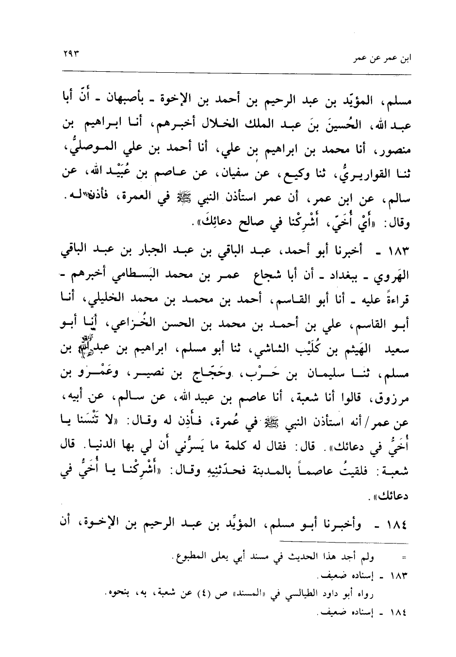 ١٨٣ - أَخْبَرَنَا أَبُو أَحْمَدَ عَبْدُ الْبَاقِي بْنُ عَبْدِ الْجَبَّارِ بْنِ عَبْدِ الْبَاقِي الْهَرَوِيُّ - بِبَغْدَادَ - أَنَّ أَبَا شُجَاعٍ عُمَرَ بْنَ مُحَمَّدٍ الْبِسْطَامِيَّ أَخْبَرَهُمْ - قِرَاءَةً عَلَيْهِ - أَنَا أَبُو الْقَاسِمِ أَحْمَدُ بْنُ مُحَمَّدِ بْنِ مُحَمَّدٍ الْخَلِيلِيُّ، أَنَا أَبُو الْقَاسِمِ عَلِيُّ بْنُ أَحْمَدَ بْنِ مُحَمَّدِ بْنِ الْحَسَنِ الْخُزَاعِيُّ، أَنَا أَبُو سَعِيدٍ الْهَيْثَمُ بْنُ كُلَيْبٍ الشَّاشِيُّ، ثَنَا أَبُو مُسْلِمٍ إِبْرَاهِيمُ بْنُ عَبْدِ اللهِ بْنِ مُسْلِمٍ، ثَنَا سُلَيْمَانُ بْنُ حَرْبٍ، وَحَجَّاجُ بْنُ نُصَيْرٍ وَعَمْرُو بْنُ مَرْزُوقٍ قَالُوا: أَنَا شُعْبَةُ، أَنَا عَاصِمُ بْنُ عُبَيْدِ اللهِ، عَنْ سَالِمٍ عَنْ أَبِيهِ عَنْ عُمَرَ «أَنَّهُ اسْتَأْذَنَ النَّبِيَّ - صَلَّى اللهُ عَلَيْهِ وَسَلَّمَ - فِي عُمْرَةٍ، فَأَذِنَ لَهُ وَقَالَ: لَا تَنْسَنَا يَا أُخَيَّ فِي دُعَائِكَ قَالَ: فَقَالَ لَهُ كَلِمَةً مَا يَسُرُّنِي أَنَّ لِي بِهَا الدُّنْيَا.» قَالَ شُعْبَةُ: فَلَقِيتُ عَاصِمًا بِالْمَدِينَةِ، فَحَدَّثَنِيهِ، وَقَالَ: أَشْرِكْنَا يَا أُخَيَّ فِي دُعَائِكَ.