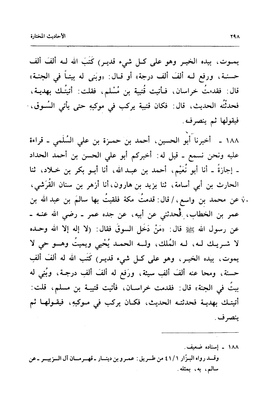 ١٨٨ - أَخْبَرَنَا أَبُو الْحُسَيْنِ أَحْمَدُ بْنُ حَمْزَةَ بْنِ عَلِيٍّ السُّلَمِيُّ - قِرَاءَةً عَلَيْهِ وَنَحْنُ نَسْمَعُ - قِيلَ لَهُ: أَخْبَرَكُمْ أَبُو عَلِيٍّ الْحَسَنُ بْنُ أَحْمَدَ الْحَدَّادُ إِجَازَةً، أَنَا أَبُو نُعَيْمٍ أَحْمَدُ بْنُ عَبْدِ اللهِ، أَنَا أَبُو بَكْرِ بْنُ خَلَّادٍ، ثَنَا الْحَارِثُ بْنُ أَبِي أُسَامَةَ، ثَنَا يَزِيدُ بْنُ هَارُونَ، أَنَا أَزْهَرُ بْنُ سِنَانٍ الْقُرَشِيُّ، عَنْ مُحَمَّدِ بْنِ وَاسِعٍ، قَالَ: «قَدِمْتُ مَكَّةَ فَلَقِيتُ بِهَا سَالِمَ بْنَ عَبْدِ اللهِ بْنِ عُمَرَ بْنِ الْخَطَّابِ، فَحَدَّثَنِي عَنْ أَبِيهِ عَنْ جَدِّهِ عُمَرَ - رَضِيَ اللهُ عَنْهُ - عَنْ رَسُولِ اللهِ - صَلَّى اللهُ عَلَيْهِ وَسَلَّمَ - قَالَ: مَنْ دَخَلَ السُّوقَ، فَقَالَ: (لَا إِلَهَ إِلَّا اللهُ وَحْدَهُ لَا شَرِيكَ لَهُ لَهُ الْمُلْكُ وَلَهُ الْحَمْدُ يُحْيِي وَيُمِيتُ وَهُوَ حَيٌّ لَا يَمُوتُ بِيَدِهِ الْخَيْرُ وَهُوَ عَلَى كُلِّ شَيْءٍ قَدِيرٌ) كَتَبَ اللهُ لَهُ أَلْفَ أَلْفِ حَسَنَةٍ، وَمَحَا عَنْهُ أَلْفَ أَلْفِ سَيِّئَةٍ، وَرَفَعَ لَهُ أَلْفَ أَلْفِ دَرَجَةٍ، وَبُنِيَ لَهُ بَيْتٌ فِي الْجَنَّةِ قَالَ: فَقَدِمْتُ خُرَاسَانَ، فَأَتَيْتُ قُتَيْبَةَ بْنَ مُسْلِمٍ قُلْتُ: أَتَيْتُكَ بِهَدِيَّةٍ، فَحَدَّثْتُهُ الْحَدِيثَ فَكَانَ يَرْكَبُ فِي مَوْكِبِهِ فَيَقُولُهَا، ثُمَّ يَنْصَرِفُ»