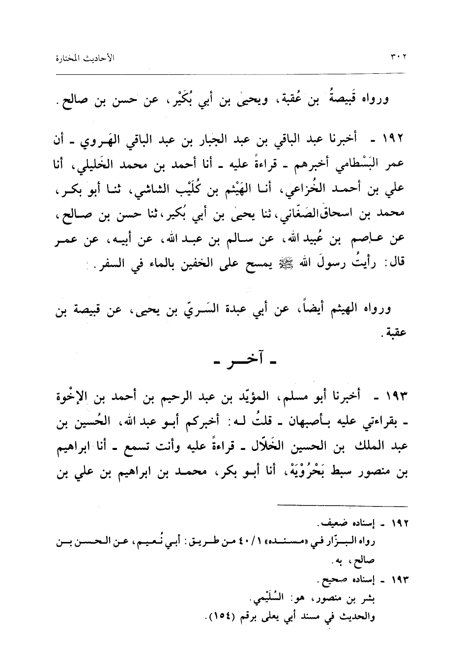 ١٩٢ - أَخْبَرَنَا عَبْدُ الْبَاقِي بْنُ عَبْدِ الْجَبَّارِ بْنِ عَبْدِ الْبَاقِي الْهَرَوِيُّ - أَنَّ عُمَرَ الْبِسْطَامِيَّ أَخْبَرَهُمْ - قِرَاءَةً عَلَيْهِ - أَنَا أَحْمَدُ بْنُ مُحَمَّدٍ الْخَلِيلِيُّ، أَنَا عَلِيُّ بْنُ أَحْمَدَ الْخُزَاعِيُّ، أَنَا الْهَيْثَمُ بْنُ كُلَيْبٍ الشَّاشِيُّ، ثَنَا أَبُو بَكْرٍ مُحَمَّدُ بْنُ إِسْحَاقَ الصَّغَانِيُّ، ثَنَا يَحْيَى بْنُ أَبِي بُكَيْرٍ، ثَنَا حَسَنُ بْنُ صَالِحٍ، عَنْ عَاصِمِ بْنِ عُبَيْدِ اللهِ، عَنْ سَالِمِ بْنِ عَبْدِ اللهِ، عَنْ أَبِيهِ، عَنْ عُمَرَ قَالَ: «رَأَيْتُ رَسُولَ اللهِ - صَلَّى اللهُ عَلَيْهِ وَسَلَّمَ - يَمْسَحُ عَلَى الْخُفَّيْنِ بِالْمَاءِ فِي السَّفَرِ».